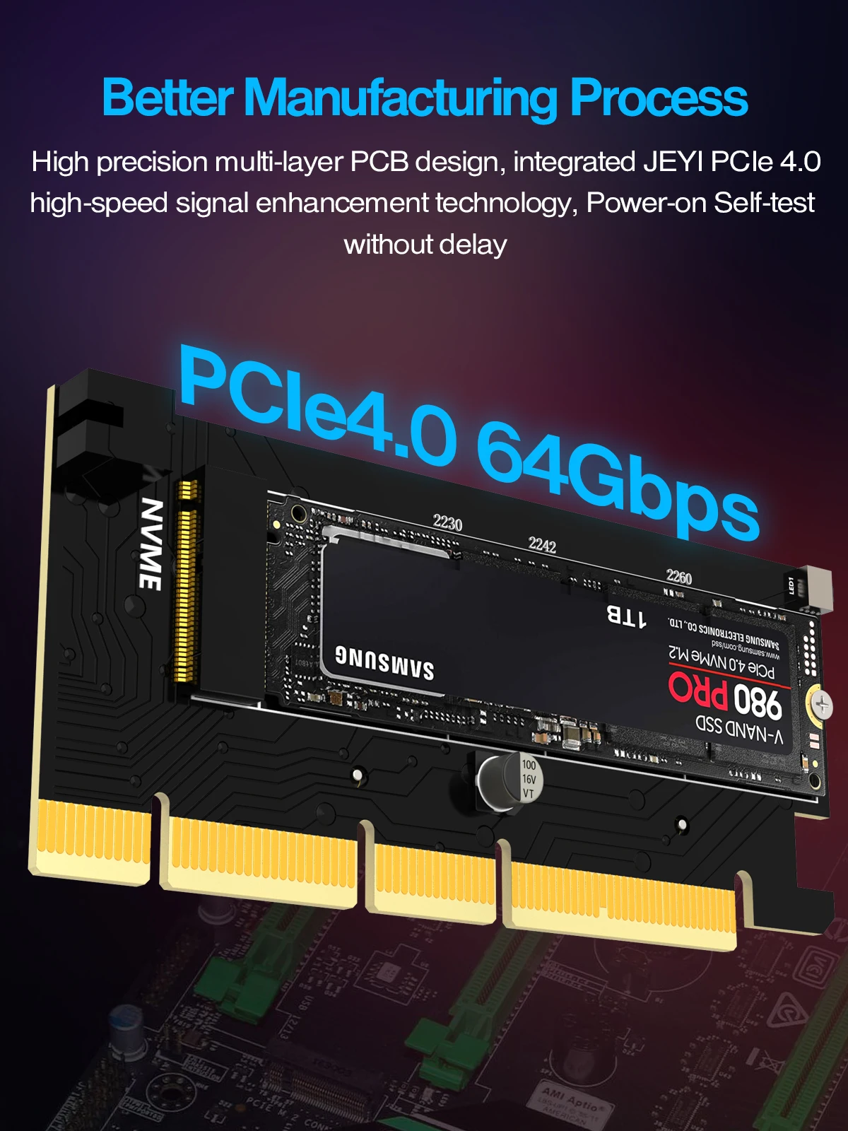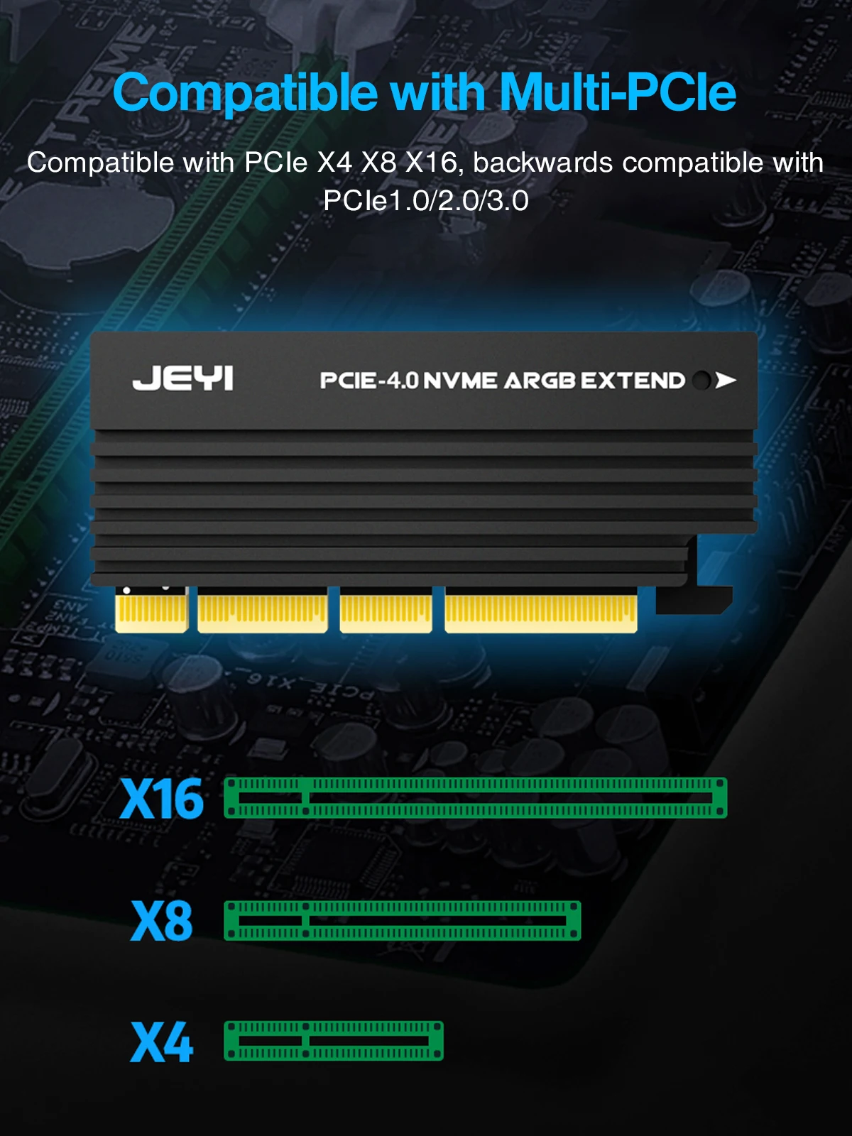 Este adaptador JEYI PCIe NVMe admite PCIe 4,0 NVMe SSD, compatible con PCIe 3,0 2,0 1,0,