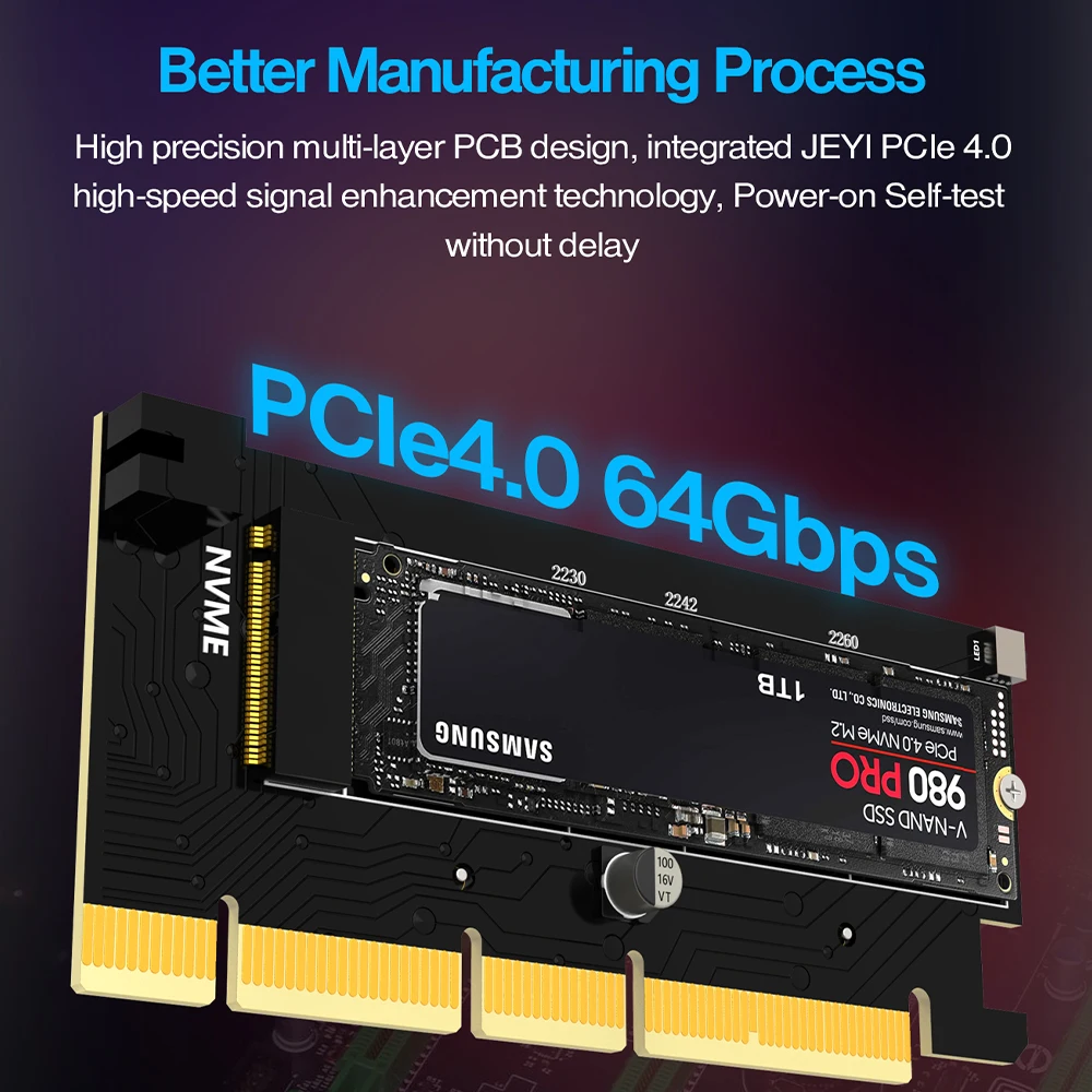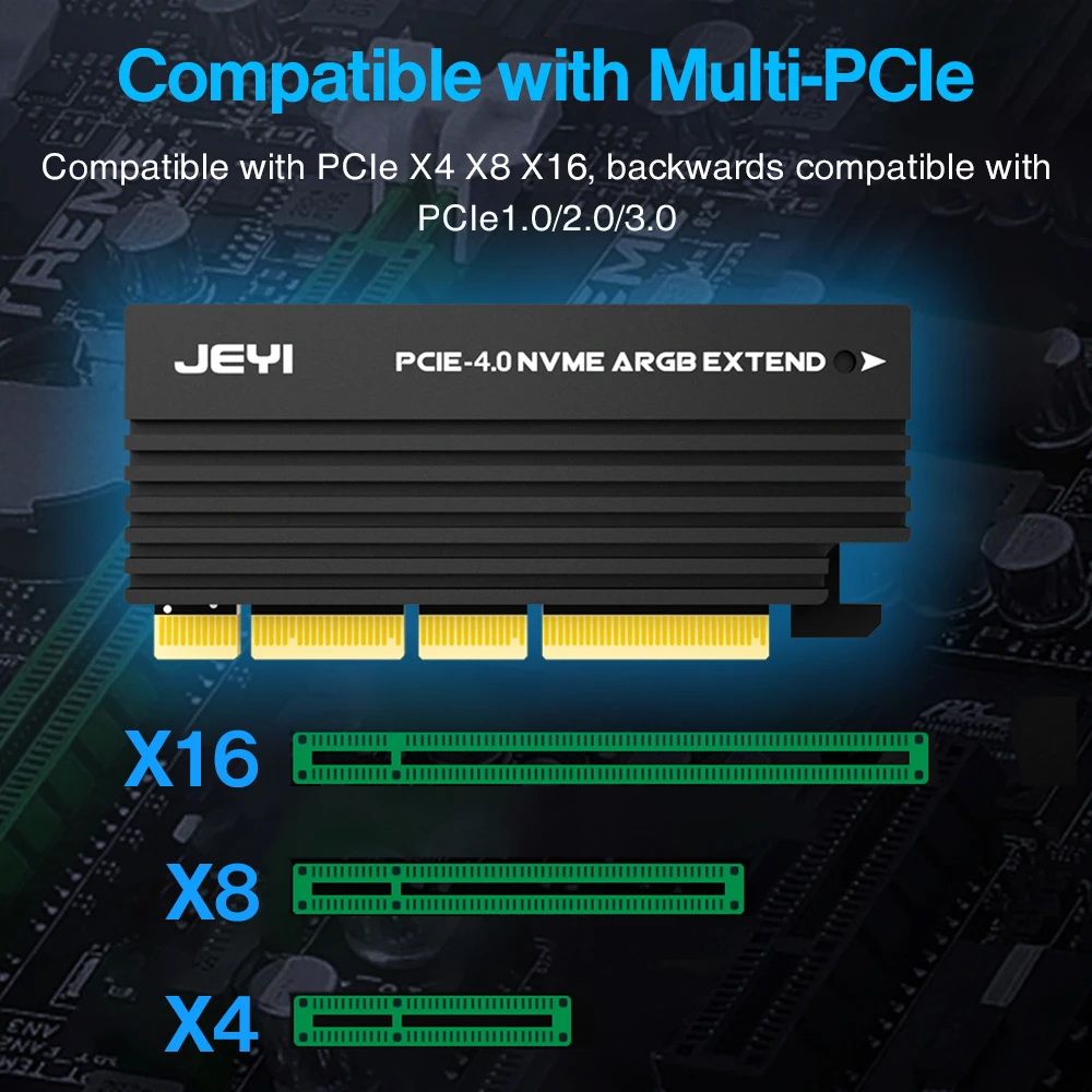 Este adaptador JEYI PCIe NVMe admite PCIe 4,0 NVMe SSD, compatible con PCIe 3,0 2,0 1,0,