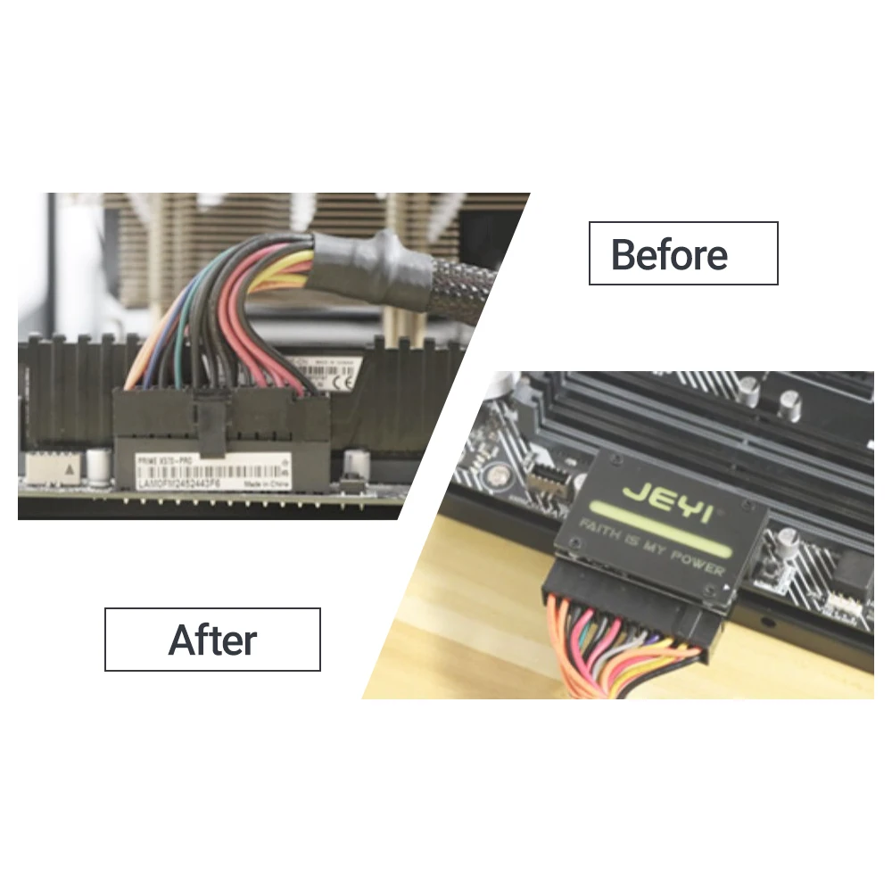 Diseño de ángulo recto: jeyi 90 grados RGB ATX 24pin adaptador está especialmente diseñado para cambiar la dirección de instalación del cable ATX 24pin, que resolverá el problema de la instalación de la fuente de alimentación en chasis de altura limitada. Perfecto para almacenar sus cables, a la vez que facilita la administración del cableado y mantiene el mainframe de su computadora con un aspecto más ordenado.