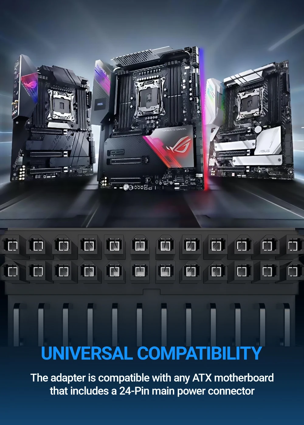 El adaptador es compatible con cualquier placa base ATX que incluya un conector de alimentación principal de 24 pines