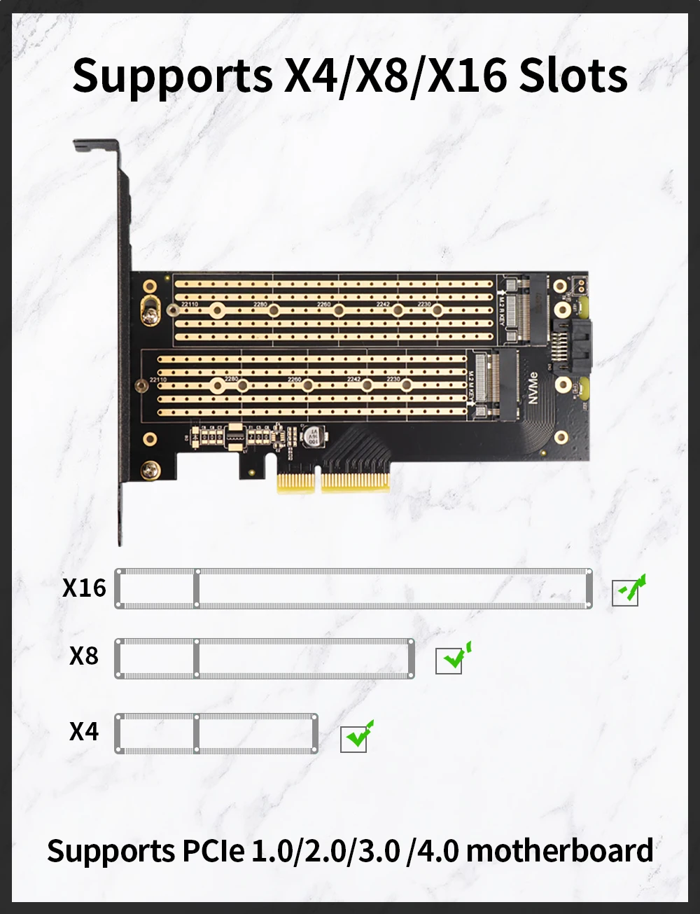 Se le recuerda amablemente que este adaptador sólo soporta ranura PCIe X4 X8X16. NO es compatible con PCIe X1 y ranura PCI.