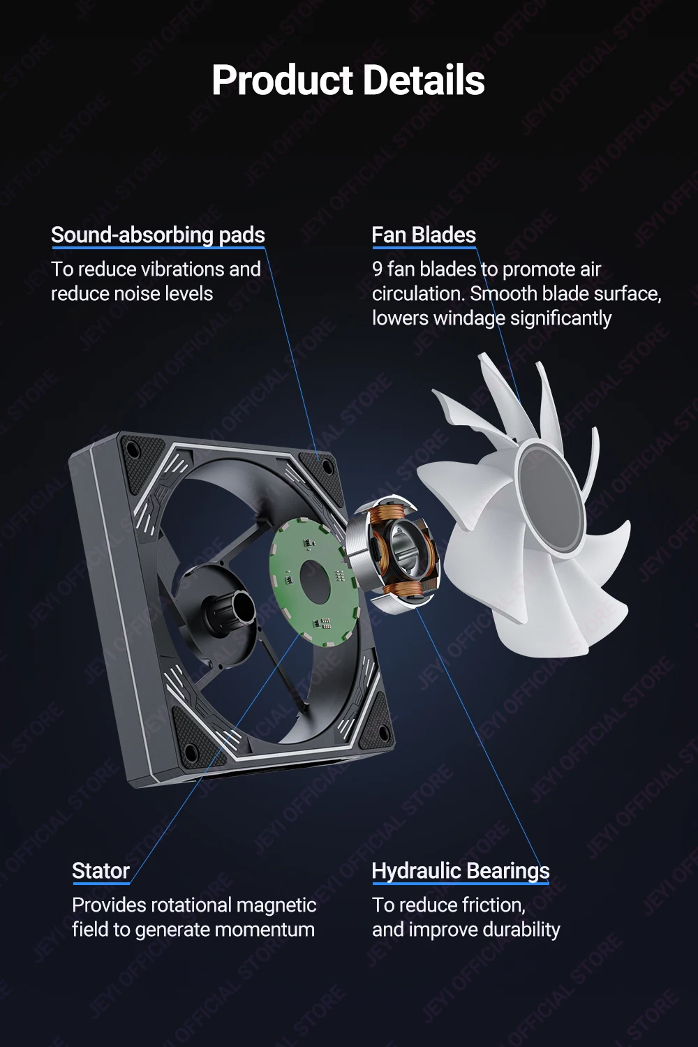 Las 9 aspas del ventilador están diseñadas con rosca, alcanzando un volumen de aire de salida de 67 CFM a 1600 RPM