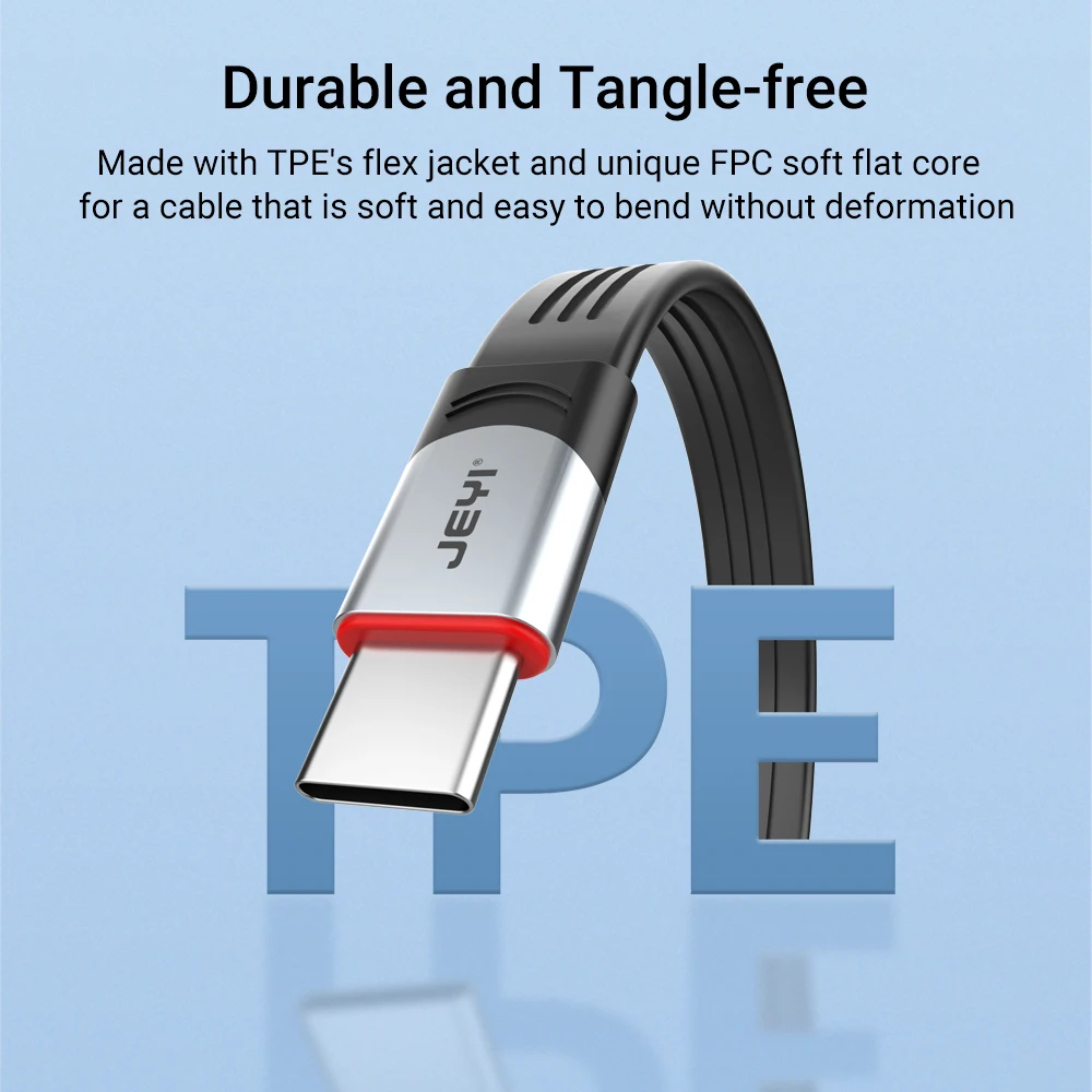El nuevo cable tipo C JEYI USB4, diseñado para optimizar su espacio de trabajo y ofrecer un rendimiento excepcional. Este cable plano reduce el desorden y proporciona conectividad Plug-and-play para dispositivos de la USB-C sin pérdida de señal. Con un chip marcado electrónicamente, el cable también es seguro para cargar.