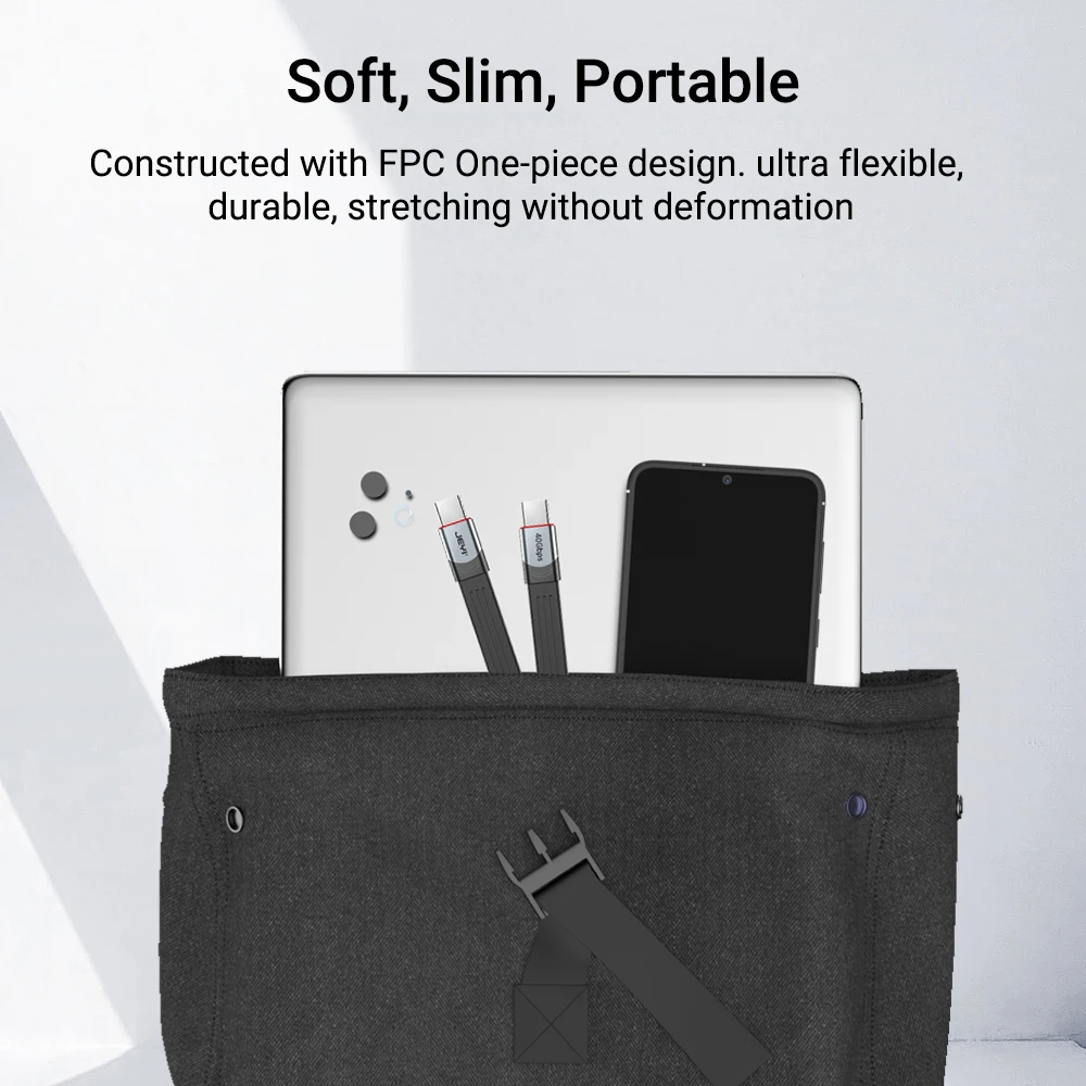 Núcleo flexible de TPE premium y cuerpo exterior de cable flexible FPC. En la prueba, puede soportar 15.000 curvas y 10.000 inserciones y extracciones.