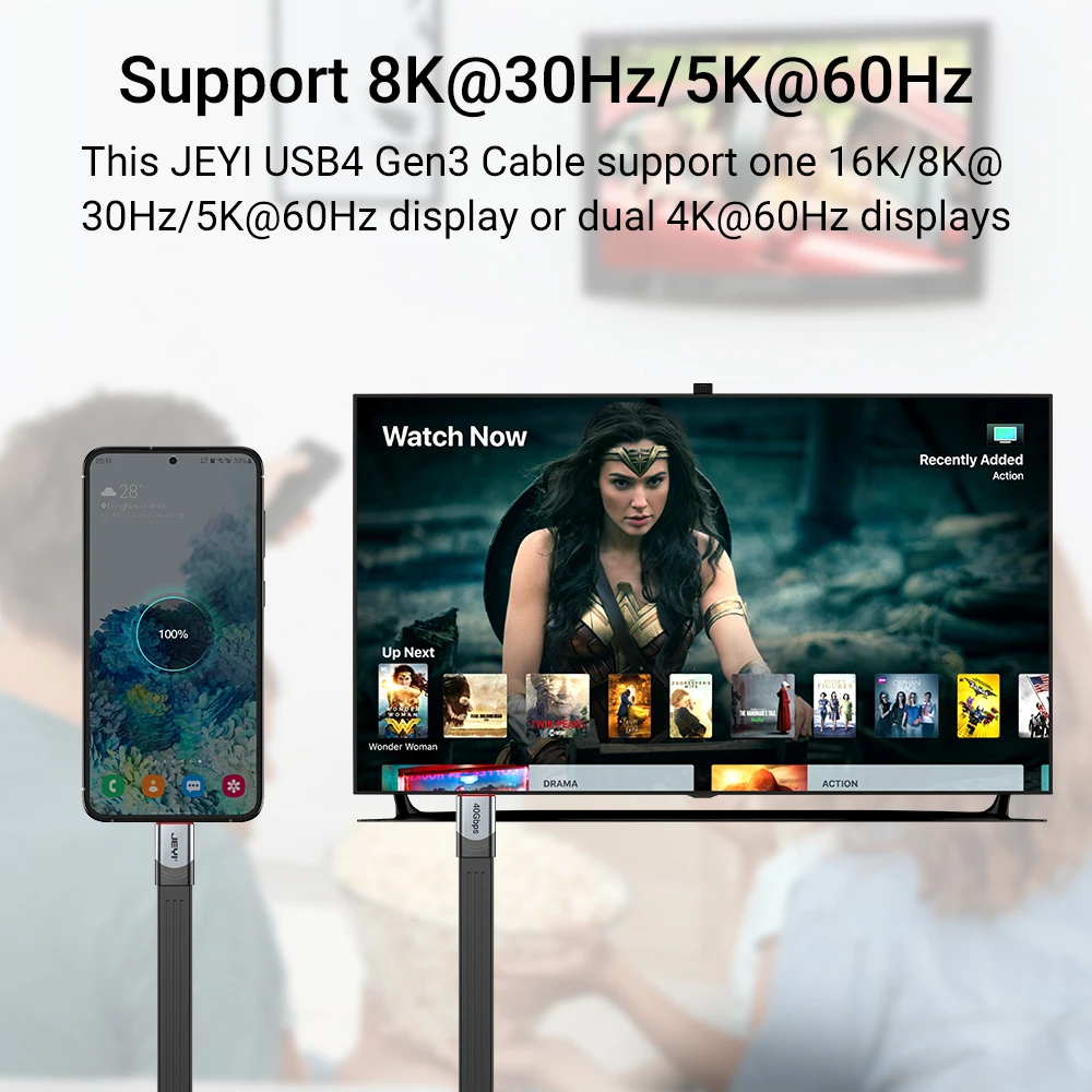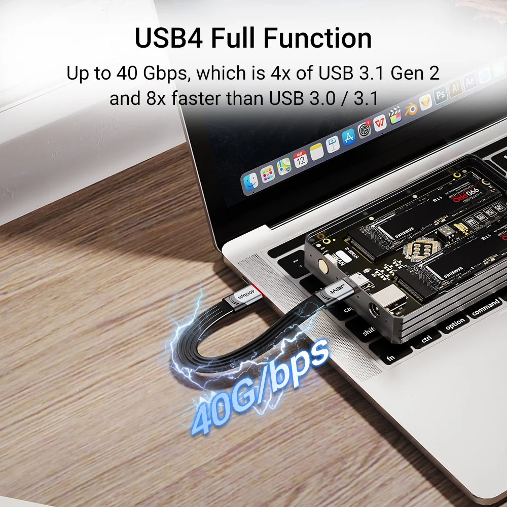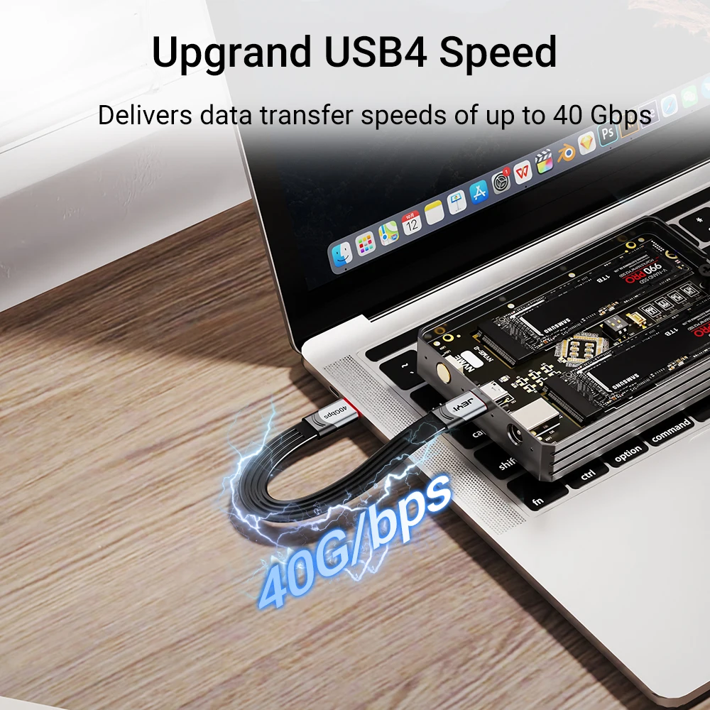 El cable USB4 JEYI ofrece velocidades de transferencia de datos ultrarrápidas de hasta 40Gbps, lo que le permite mover archivos grandes en segundos. Es totalmente compatible con USB3.2, 3,1 y 2,0 velocidades y dispositivos (velocidad de transferencia de datos dependiendo del soporte de su dispositivo).