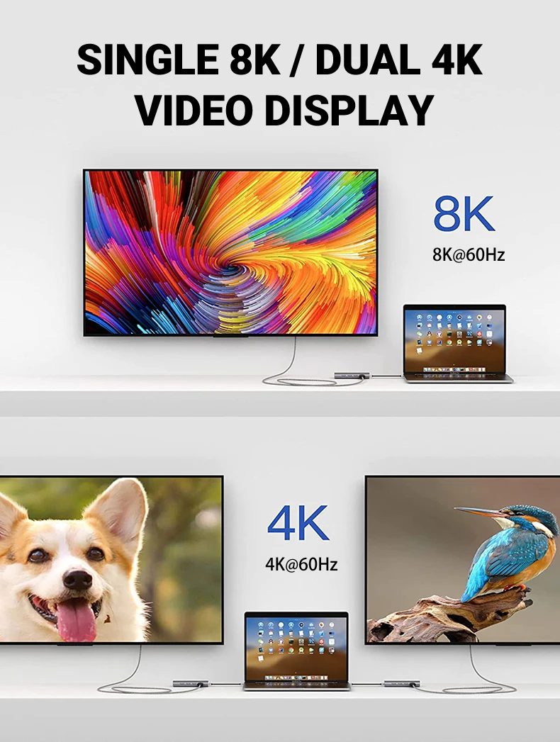 Admite pantallas duales 4K @ 60Hz individuales de 8K @ 60Hz con un ancho de banda de vídeo excepcional, o pantalla 4K en dos pantallas simultáneamente.