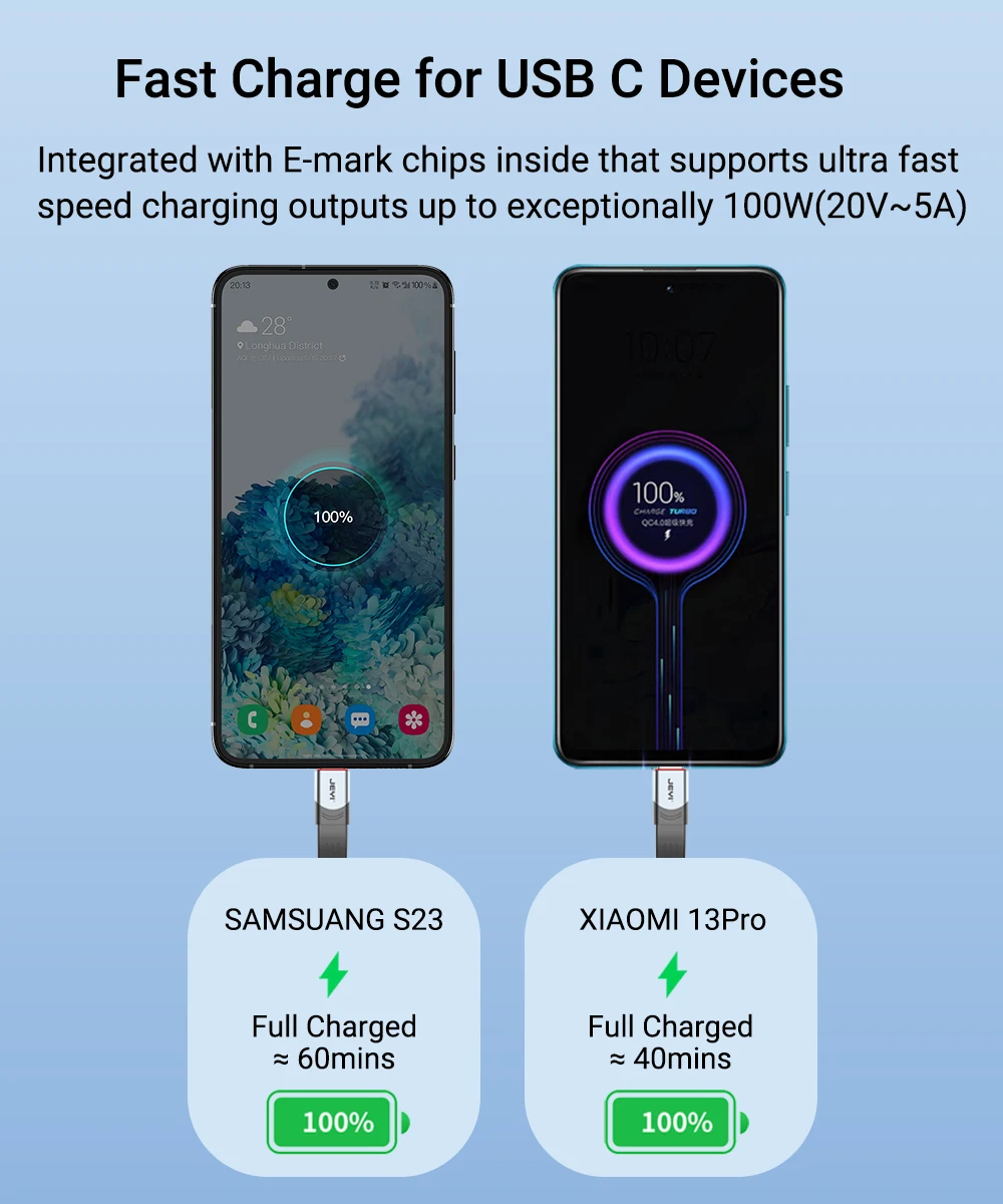 El cable JEYI USB-C ofrece una carga rápida de hasta 100W (20V/5A), por lo que es adecuado para cualquier dispositivo tipo C compatible con PD. Es compatible con Thunderbolt 4, Thunderbolt 3, USB4 y USB-C dispositivos alimentados por un ordenador portátil o teléfono, es compatible con versiones anteriores y reconoce automáticamente la velocidad de carga.