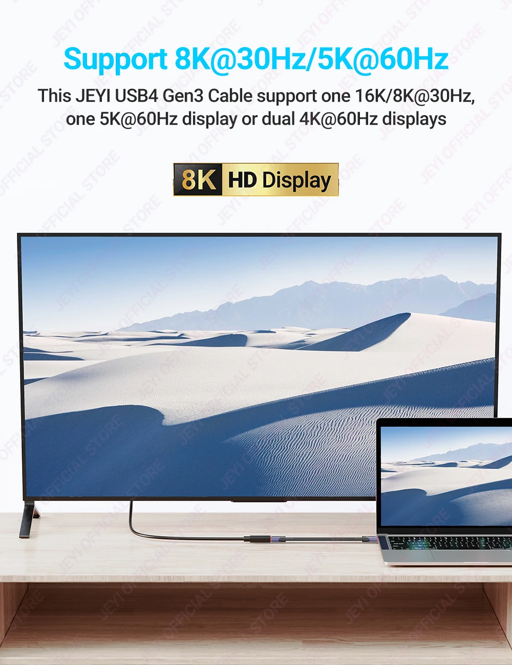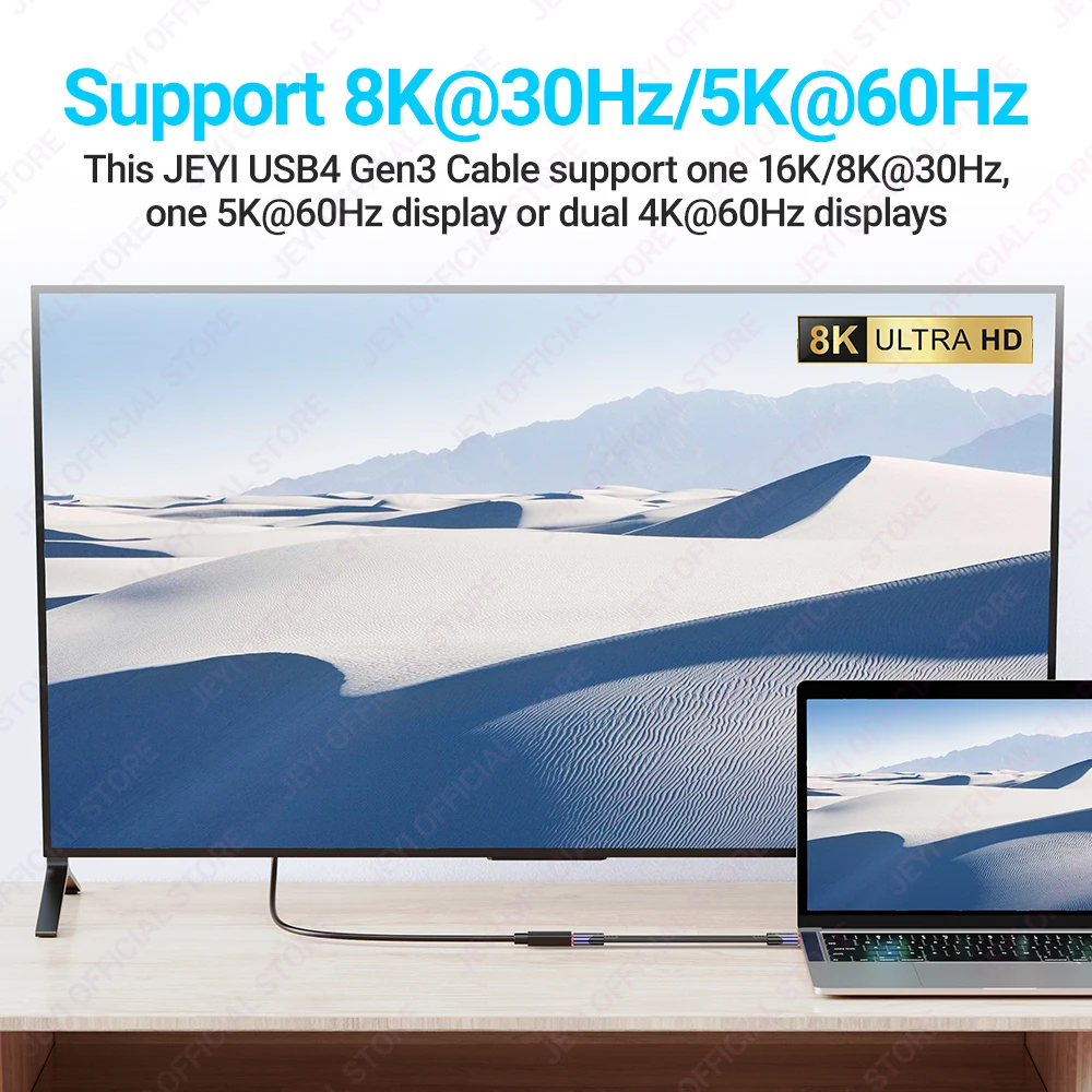Este cable JEYI USB4 Gen3 admite una pantalla de 16K/8K@30Hz, una pantalla de 5K@60Hz o pantallas duales de 4K@60Hz