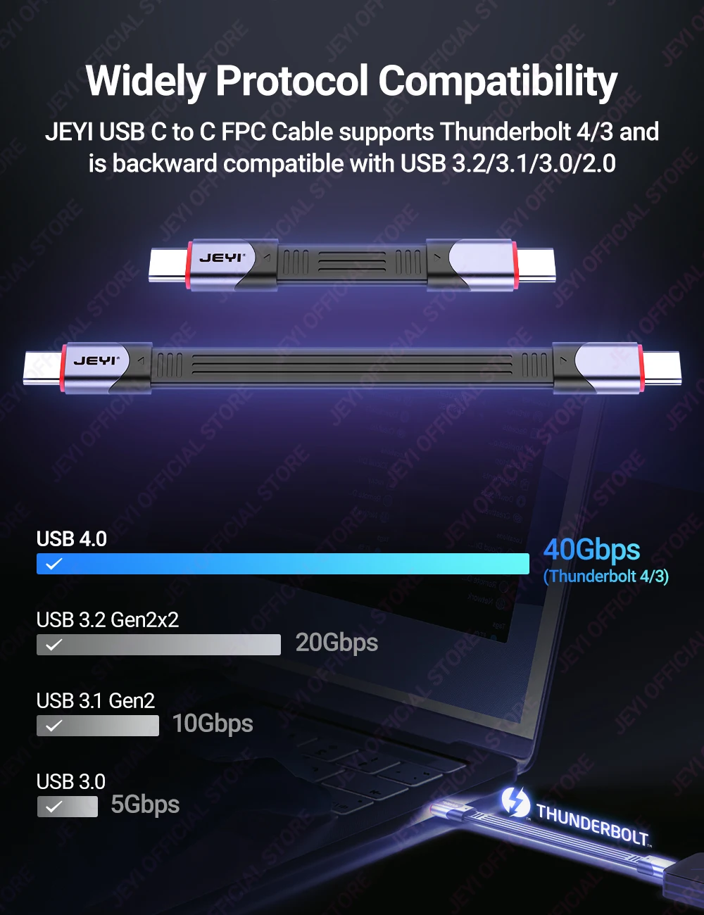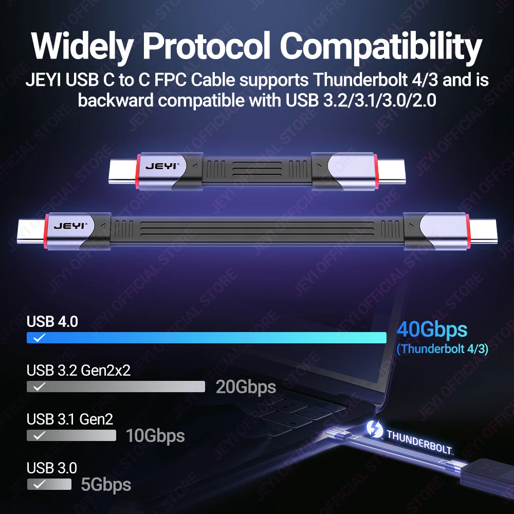 El cable JEYI USB C a C FPC es compatible con Thunderbolt 4/3 y es compatible con versiones anteriores de USB 3.2/3.1/3.0/2.0
