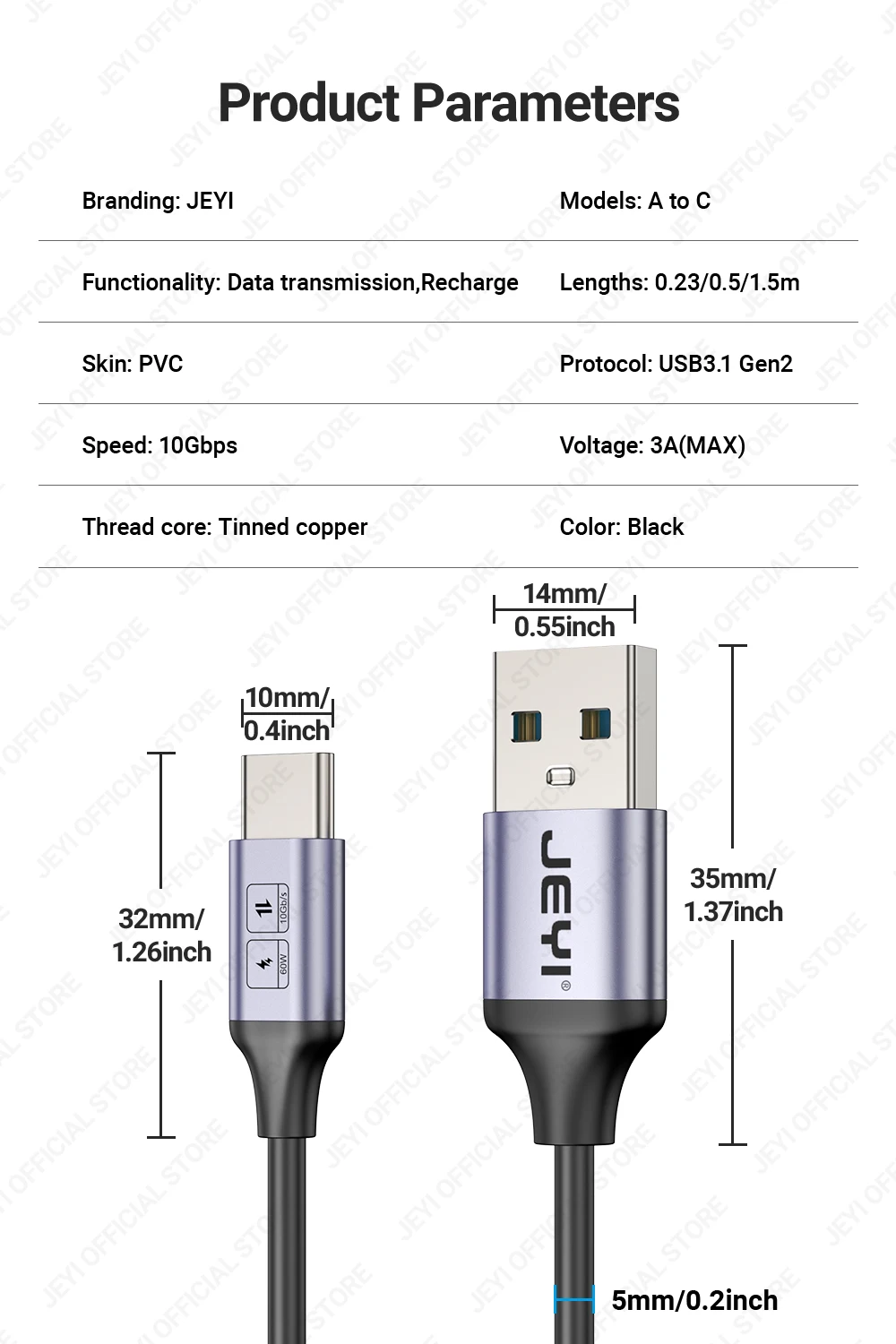 Comprar JEYI Cable USB A a tipo C 60W carga rápida Cable de datos de 10Gbps cargador USB para Samsung Xiaomi HTC Redmi Huawei USB-C de teléfono móvil