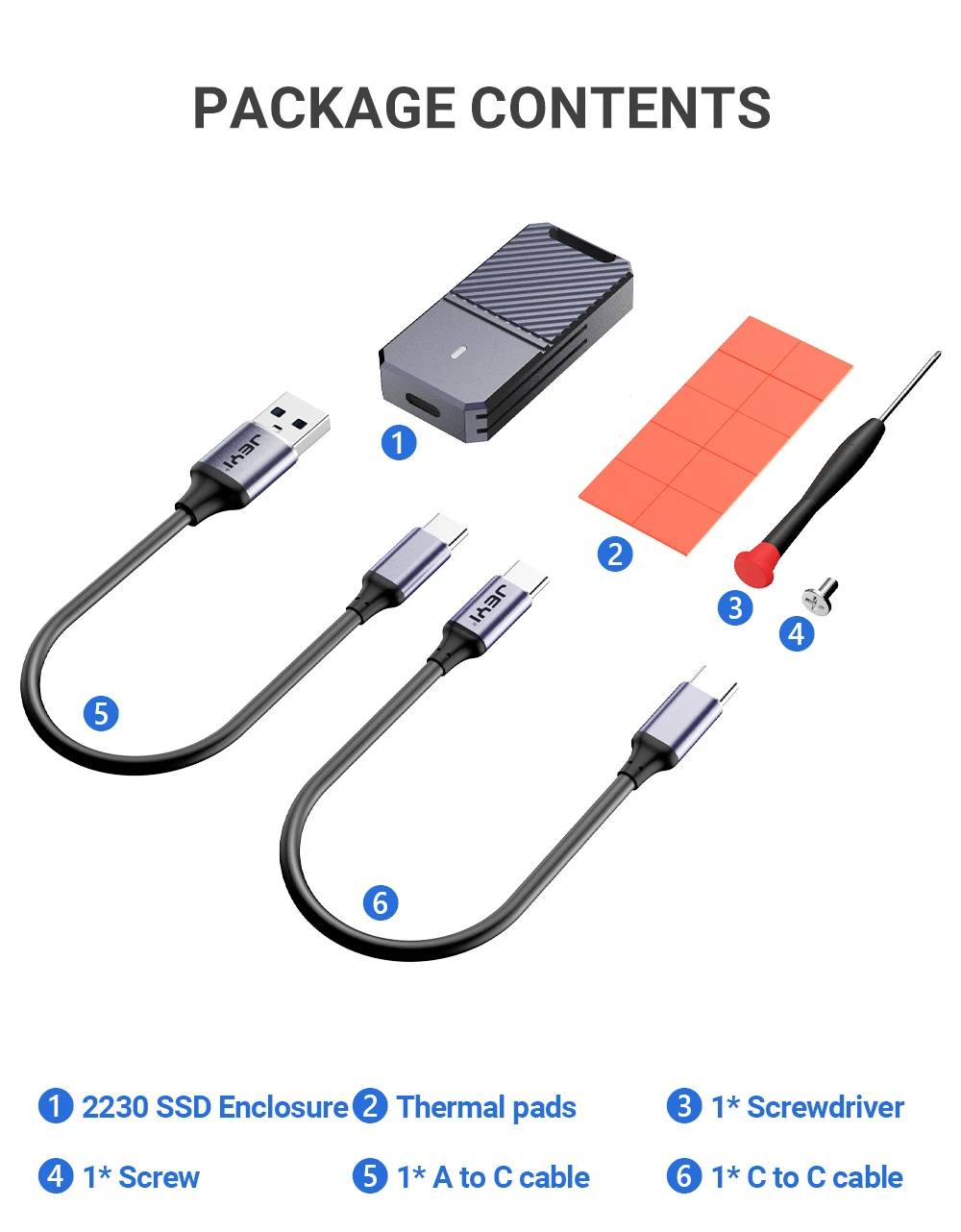 • USB 3.2 10Gbps :El JEYI 2230 NVMe SSD Enclose viene con soporte USB 3.2 10Gbps, lo que le permite transferir archivos grandes de forma rápida y eficiente.