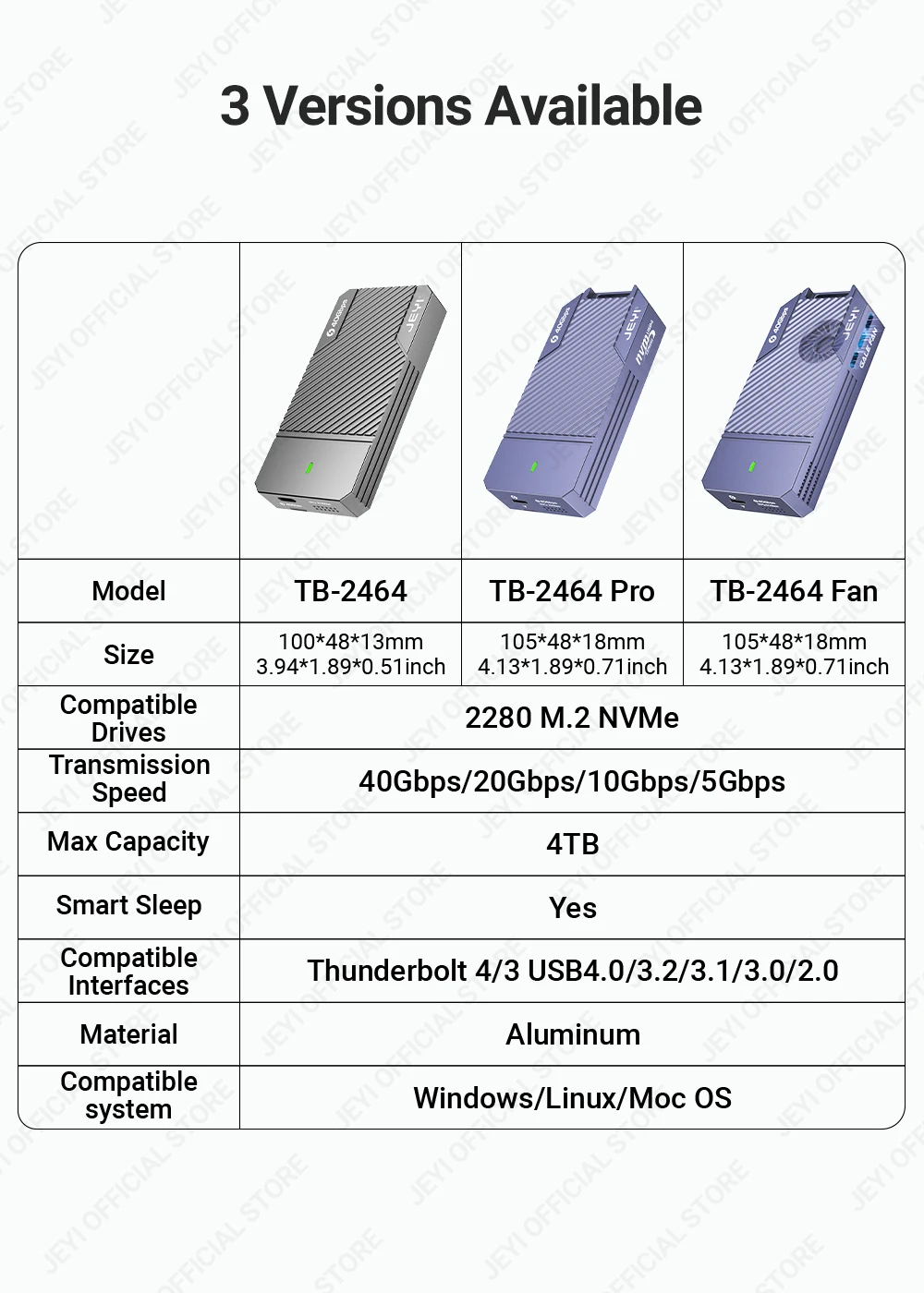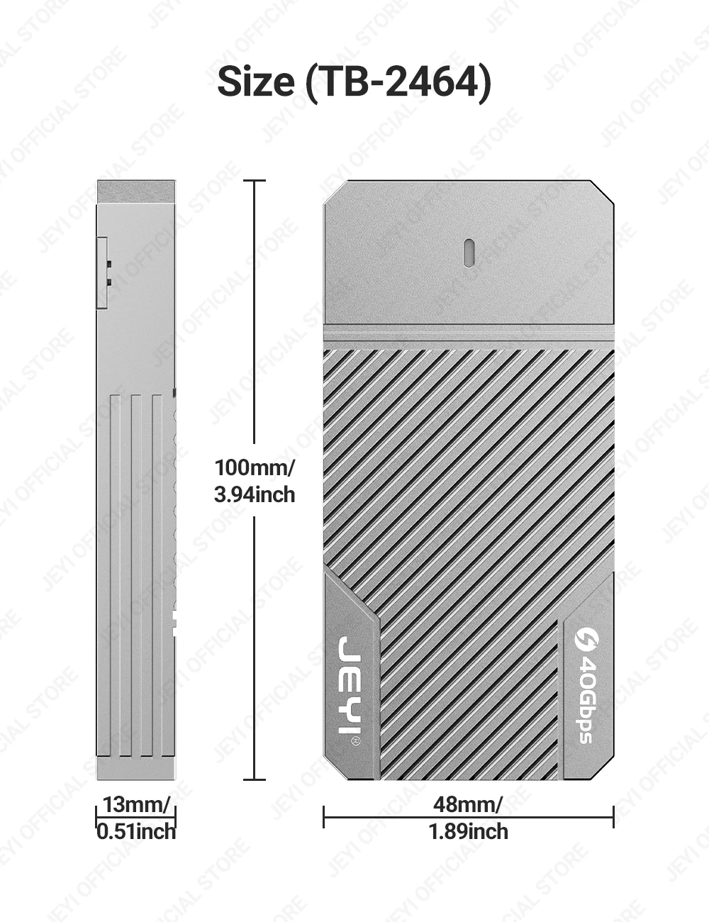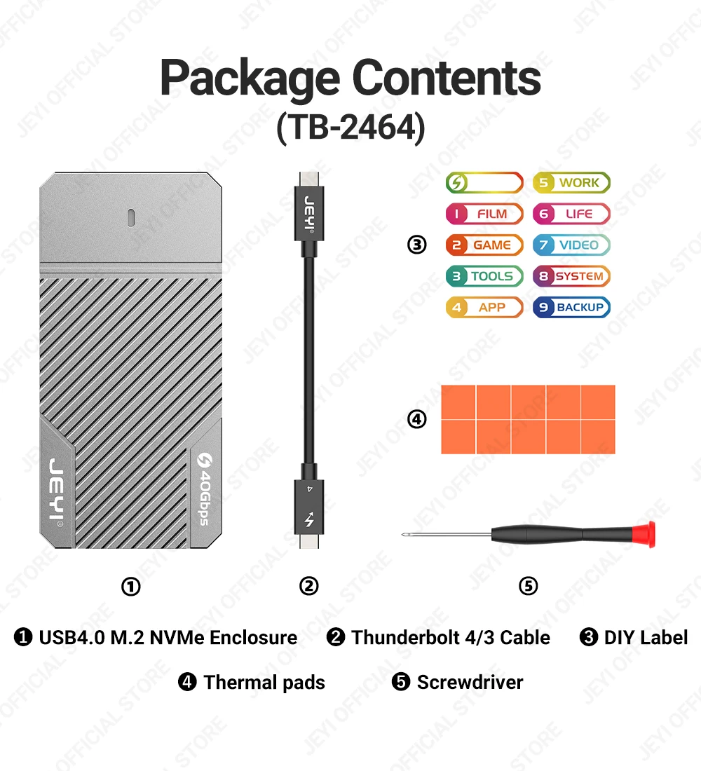 La carcasa JEYI ASM2464 NVMe 40G transforma tu SSD M.2 NVMe en una carcasa de disco duro móvil compacta y portátil. Cuenta con una interfaz de salida USB 4,0 tipo C, que admite una velocidad máxima de transmisión de hasta 40Gbps. Equipado con el último chip ASM2464, es compatible con Thunderbolt3/4 y admite túneles duales PCIe y USB.