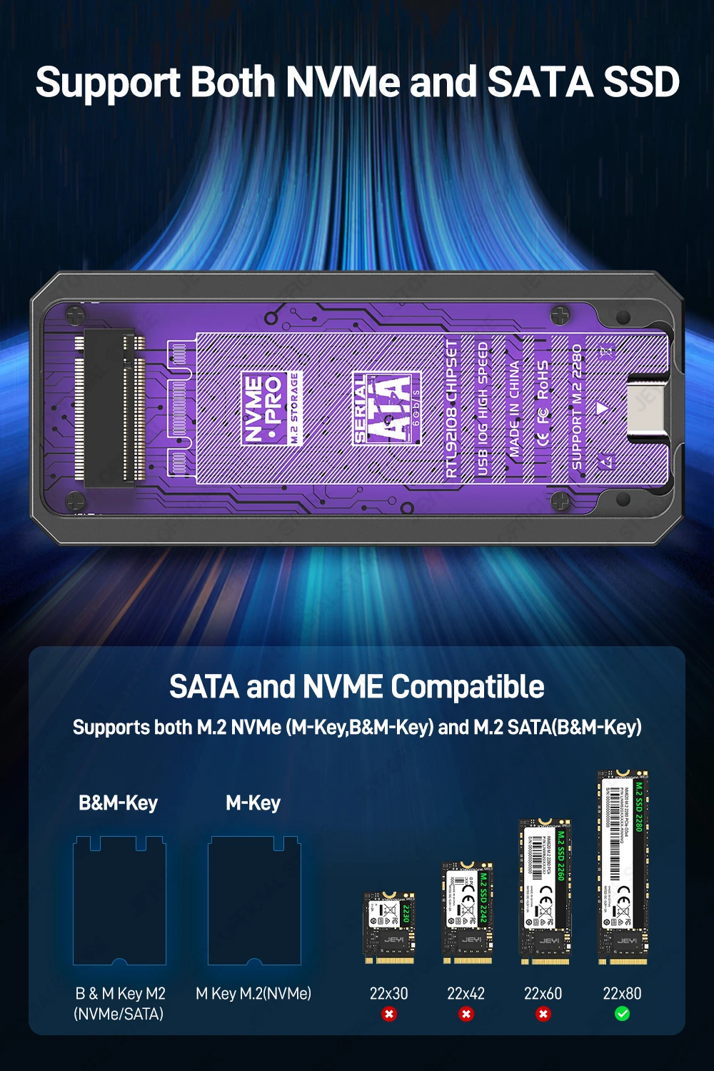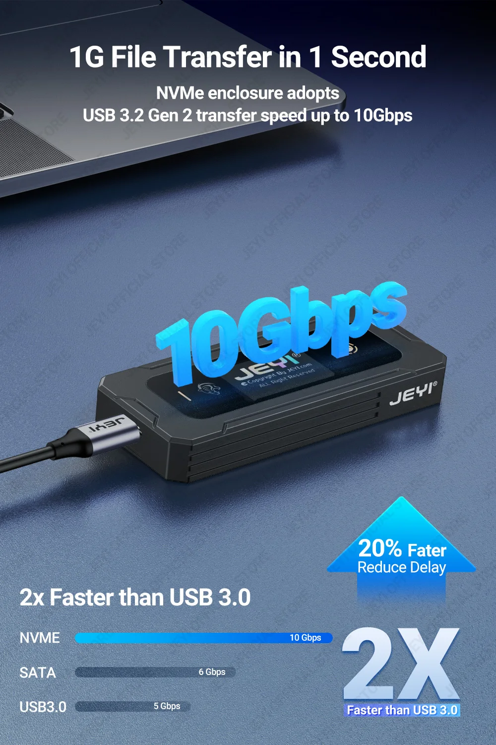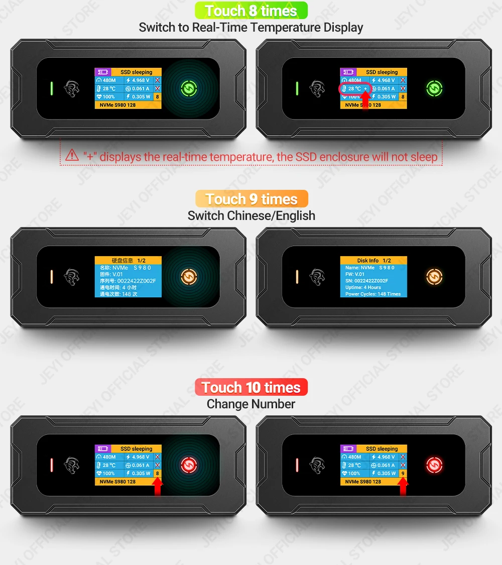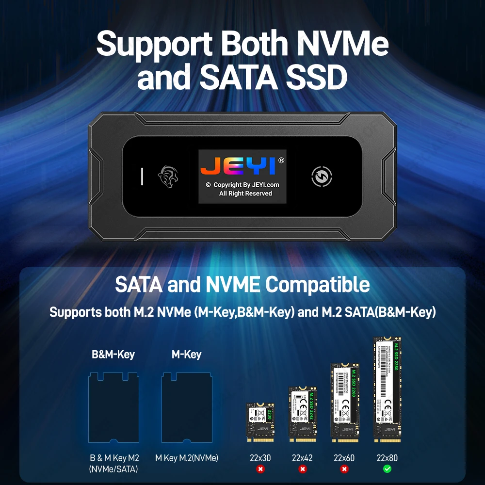 Comprar JEYI-carcasa Visual Smart M.2 NVMe / SATA SSD, USB 3,2, 10gbps, 10 modos de configuración, soporte de temperatura en tiempo Real, llave M B + M, UASP