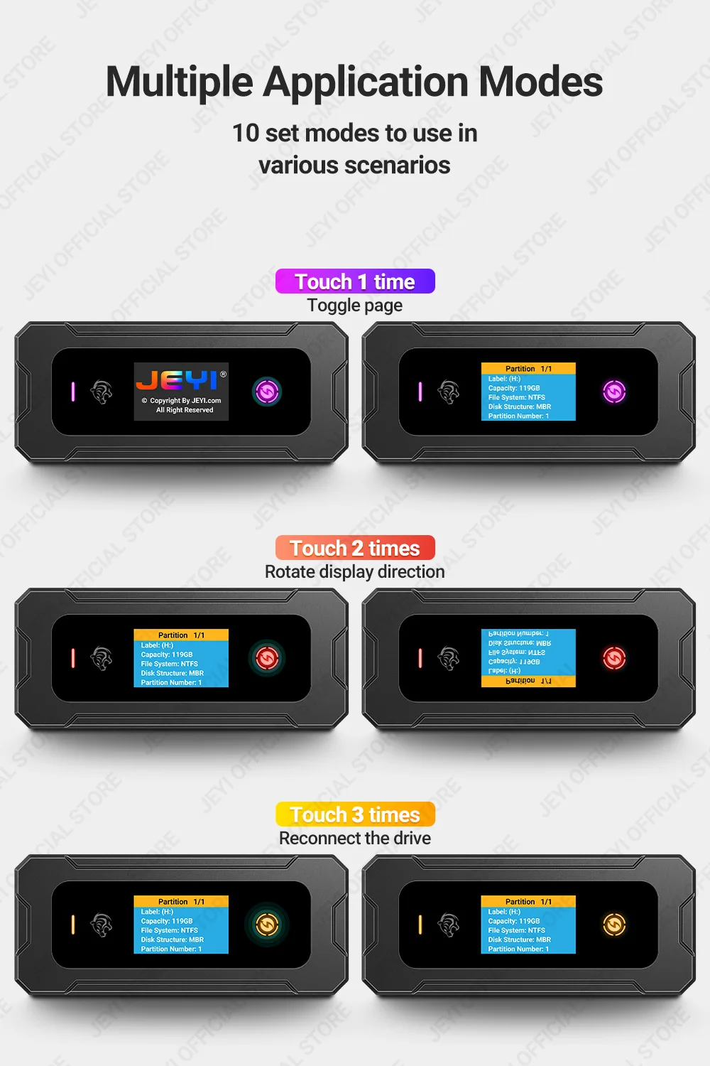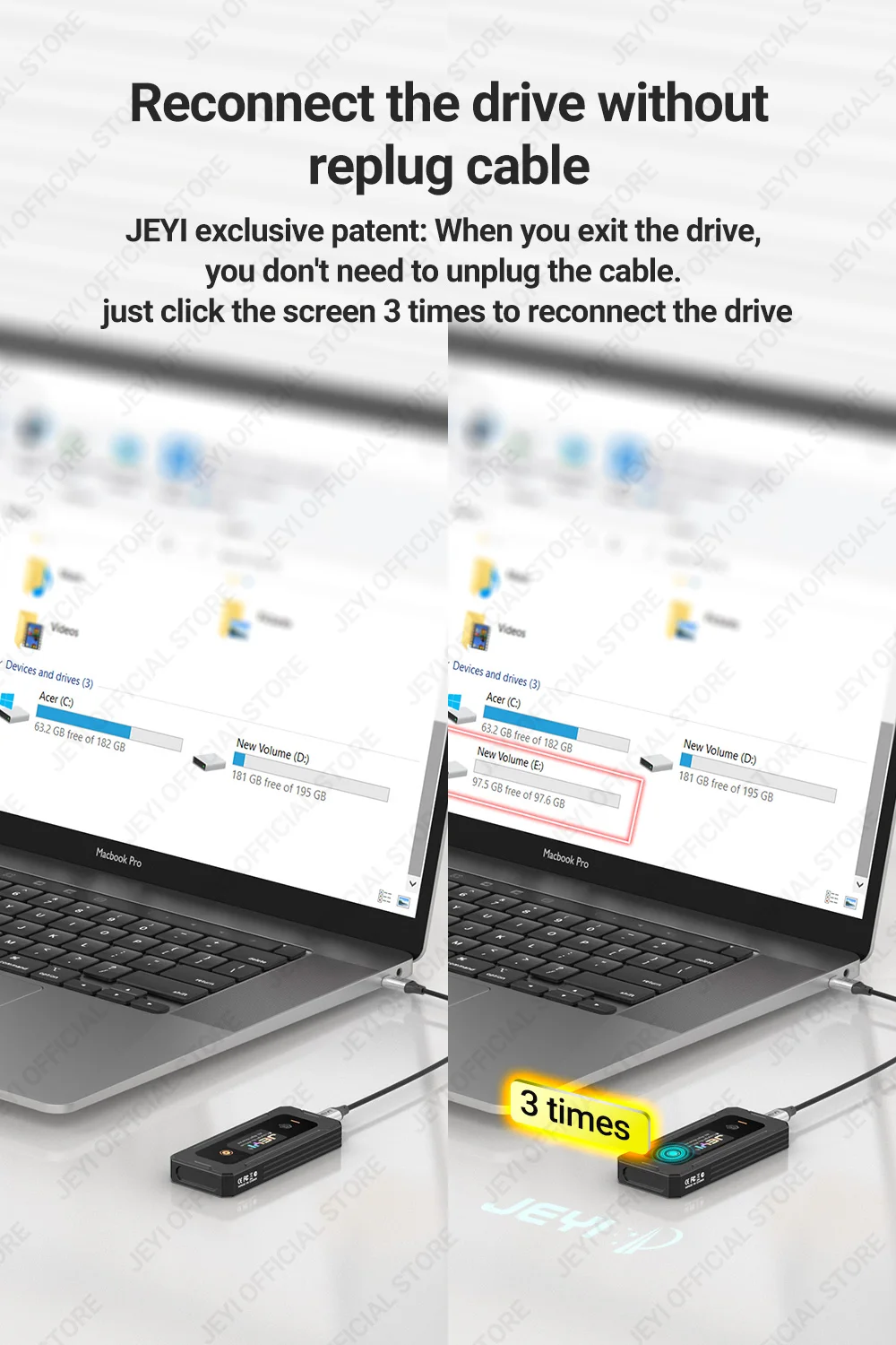 Simplifique la gestión del disco duro con nuestra reconexión rápida patentada. Tres toques en la pantalla y estará conectado, sin necesidad de desenchufar el cable. (Número de patente JEYI: 202320863617,0)