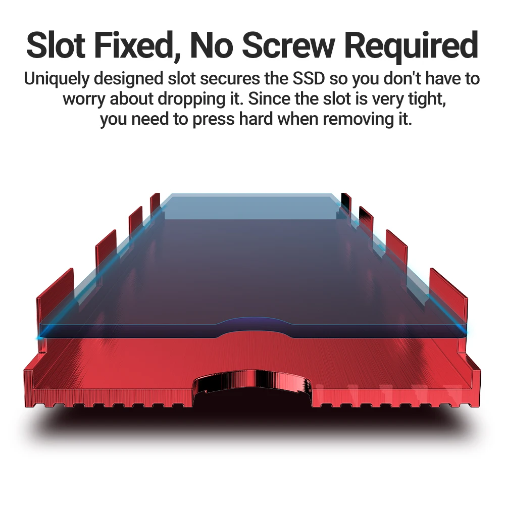 Ranura fija, no se requiere tornillo La ranura de diseño único asegura el SSD para que no tenga que preocuparse por caerlo. Dado que la ranura está muy apretada, debe presionar con la herramienta al retirarla.