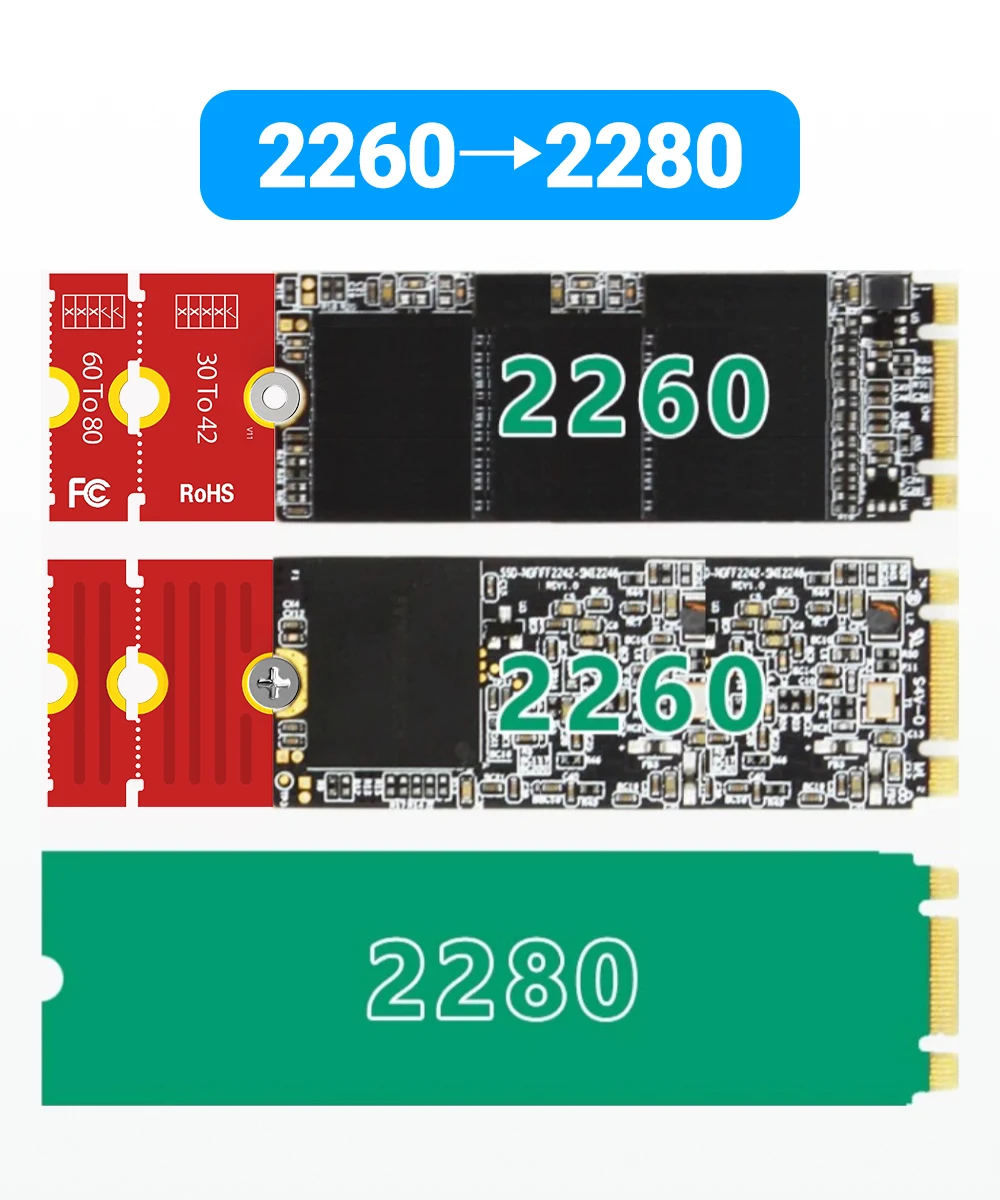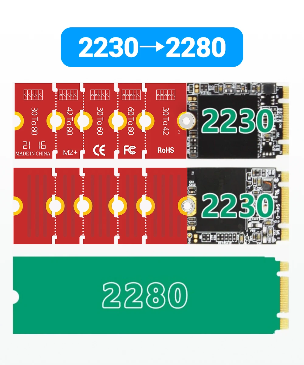 Puede soportar 2230 a 2242/2260/2280, 2242 a 2280, 2260 a 2280. No admite de 2242 a 2260.