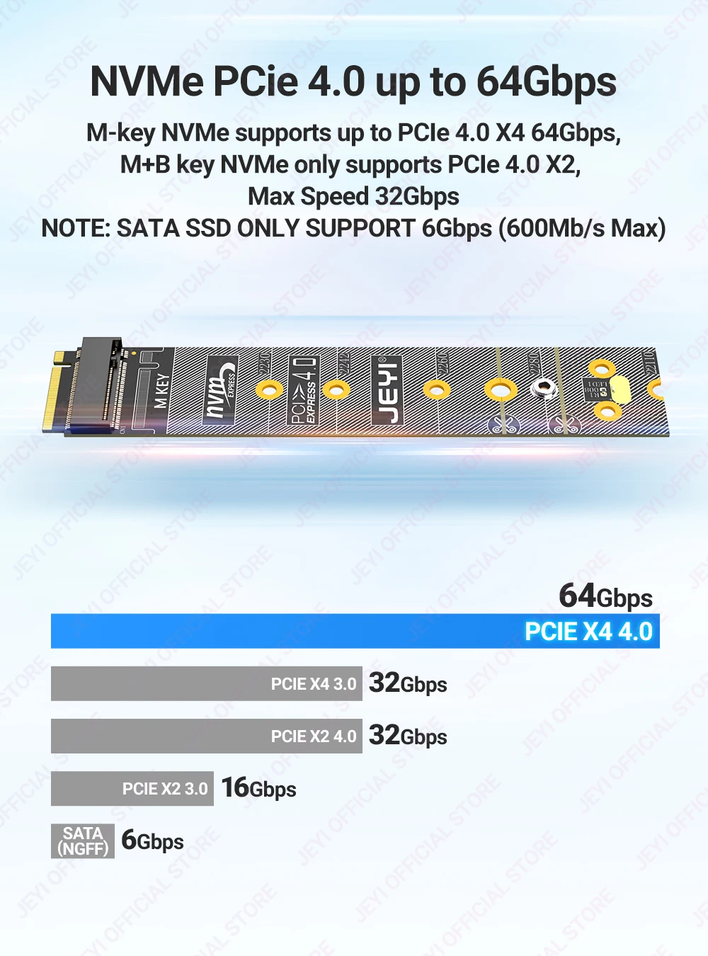 M-key NVMe supports up to PCIe 4.0 X4 64Gbps, M+B key NVMe only supports PCIe 4.0 X2, Max Speed 32Gbps NOTE: SATA SSD ONLY SUPPORT 6Gbps (600Mb/s Max)