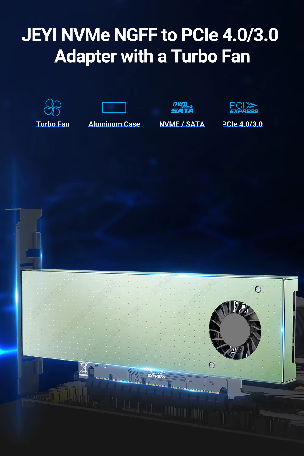 Adaptador JEYI NVMe NGFF a PCIe 4.0/3.0 con ventilador Turbo