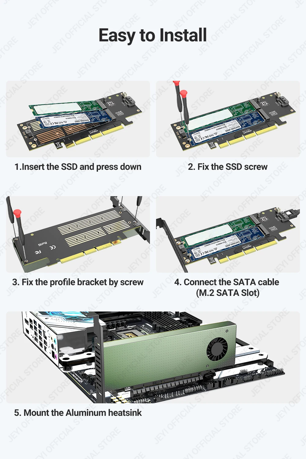 Adaptador JEYI SK9 Dual M.2 PCIE para SATA o PCIE NVMe SSD, con turboventilador, SSD M.2 NVME (llave m) y SATA (llave b) 22110 2280 2260 2242 2230 a PCI-e x 4 Tarjeta de expansión del controlador de host