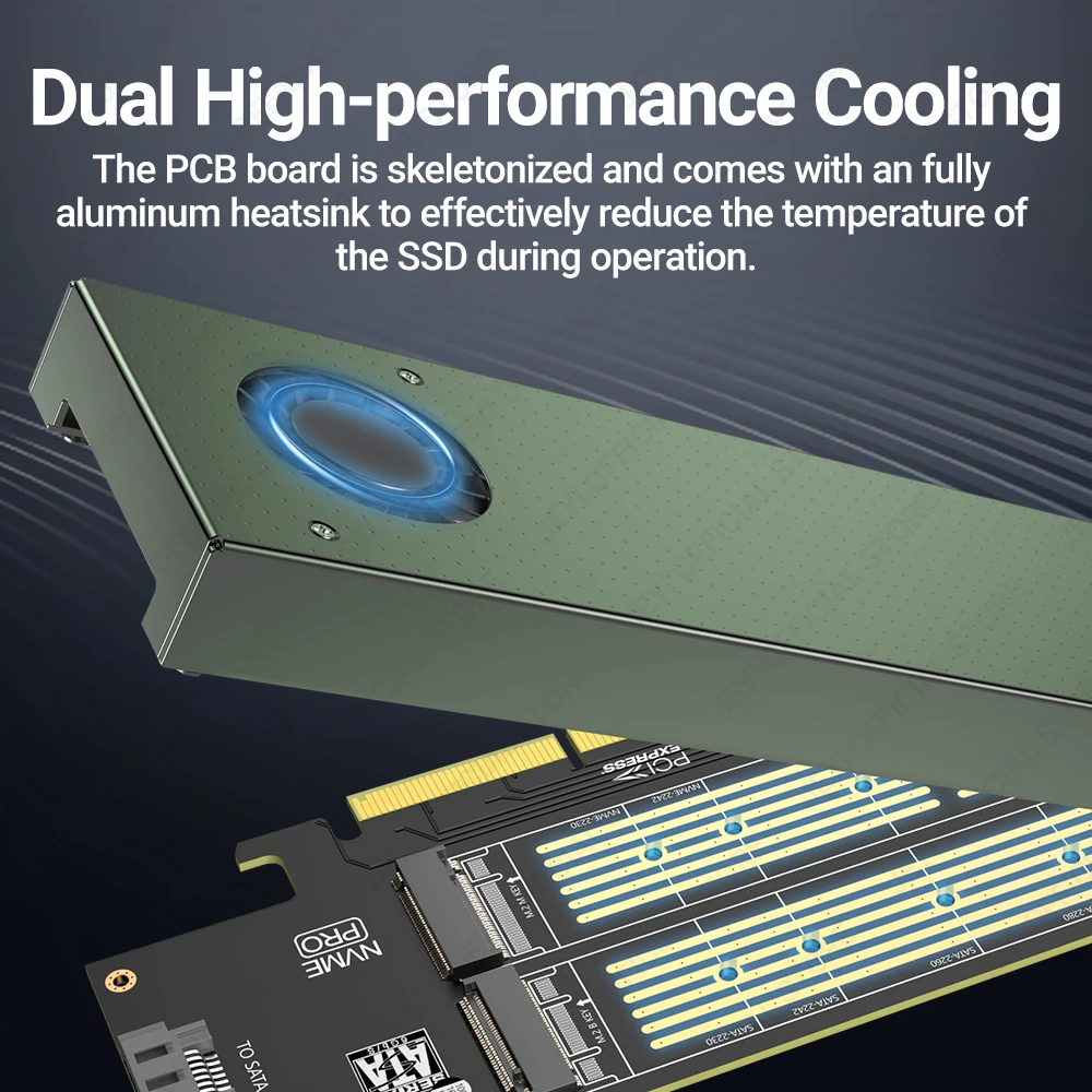 Adaptador JEYI SK9 Dual M.2 PCIE para SATA o PCIE NVMe SSD, con turboventilador, SSD M.2 NVME (llave m) y SATA (llave b) 22110 2280 2260 2242 2230 a PCI-e x 4 Tarjeta de expansión del controlador de host