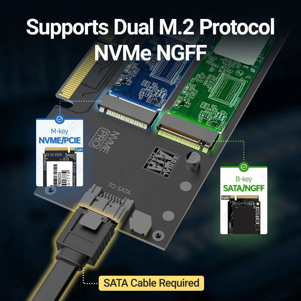 ➤ Convierte una interfaz M.2 NVMe SSD (llave M) en interfaz PCIe 4.0 x4/8/16 (compatible con PCIe 3.0 2.0 1.0), convierte una interfaz M.2 SATA SSD (llave B) en interfaz SATA de 6 Gbps (se requiere conexión de cable SATA). ).