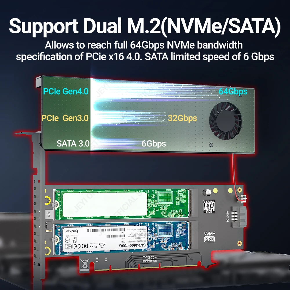 Comprar JEYI SK9 M.2 Adaptador Dual PCIE 4.0 para NVMe / NGFF SSD con ventilador turbo, NVME (tecla m) y ranura SATA (tecla b) SSD a PCIe x4 X8 X16