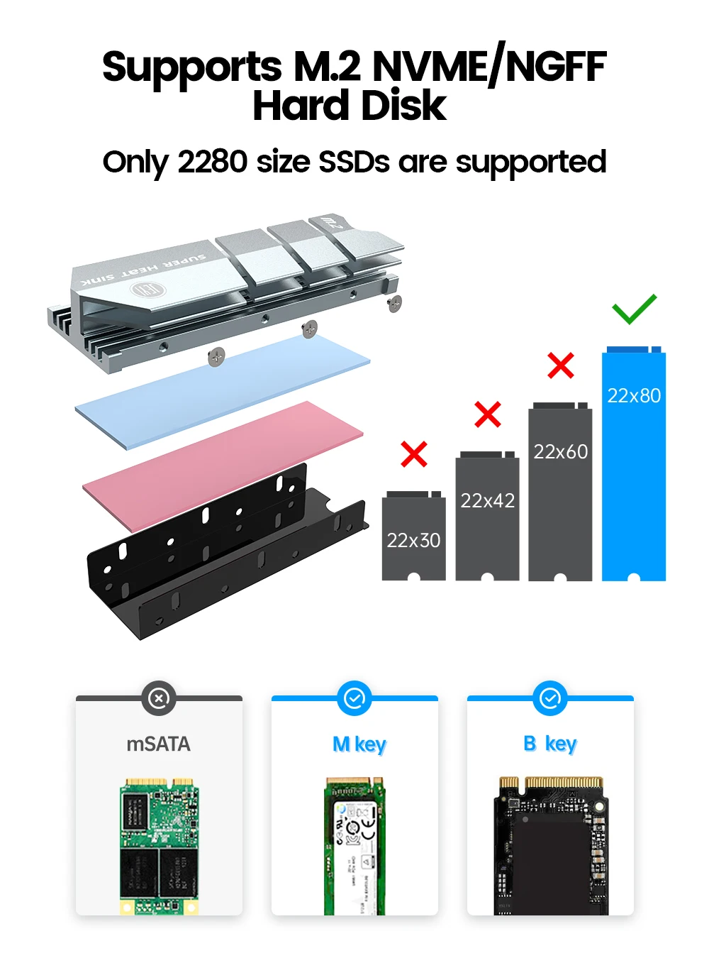 El disipador de calor tiene un marco atornillado e incluye dos almohadillas compuestos térmicos de alta conductividad que pueden llenar el espacio de contacto del SSD.Cuando se aprietan los tornillos, la disipación de calor del SSD será más rápida y las almohadillas compostas térmicas suaves pueden hacer que la base sólida del disipador de calor toque suavemente el SSD sin dañarlo.