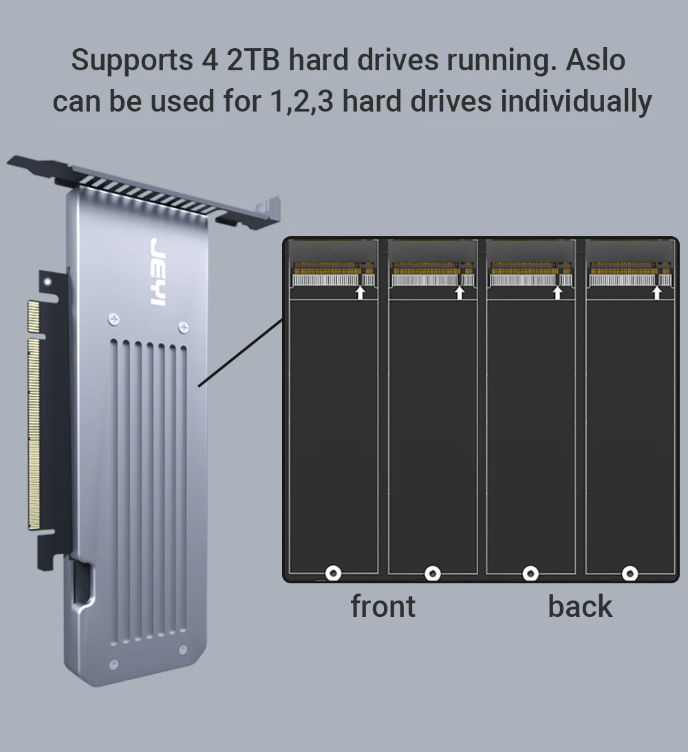 1, please be sure that your motherboard PCIe x16 slot support PCIe Bifurcation - signal split into four PCIe x4, general ordinary motherboard if the BIOS inside the "PCIEX16 Bifurcation" and other similar options, options to go in after seeing "PCIE 4x4" and other similar settings generally support Bifurcation; server motherboard chips are not the same, please consult your motherboard official for details. If the PCIe slot can not be Bifurcation or BIOS is not set to x4x4x4 x4, only one hard drive can be recognized. If the motherboard can only be set to x8 x4 x4 can only recognize 3 disks.