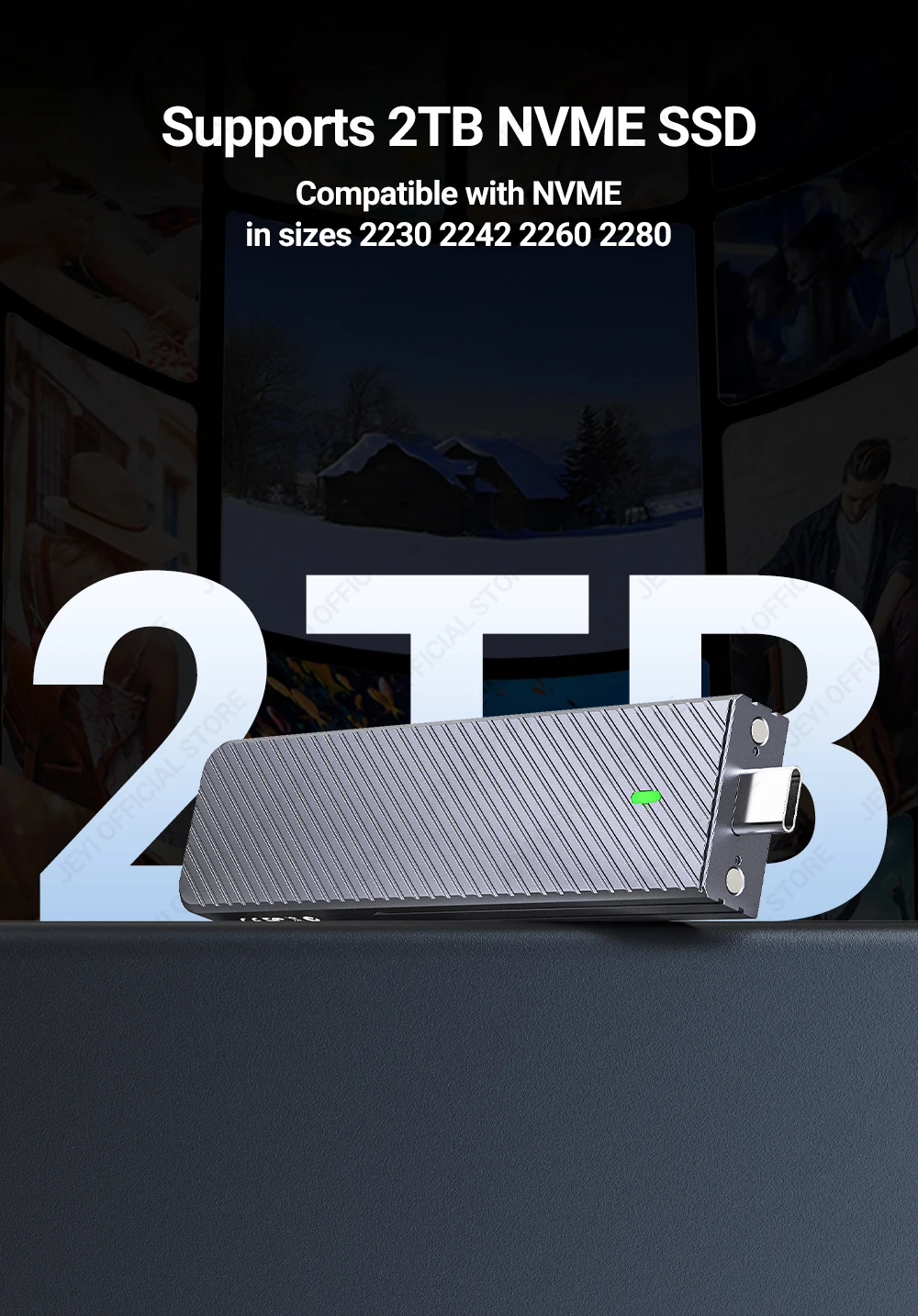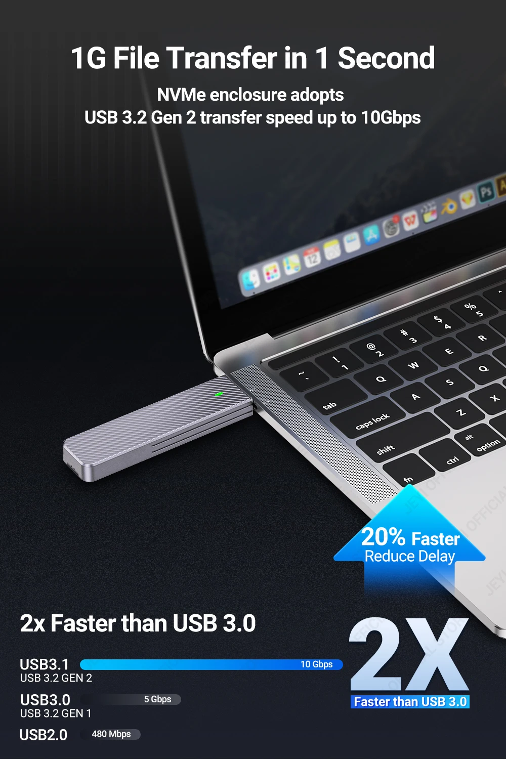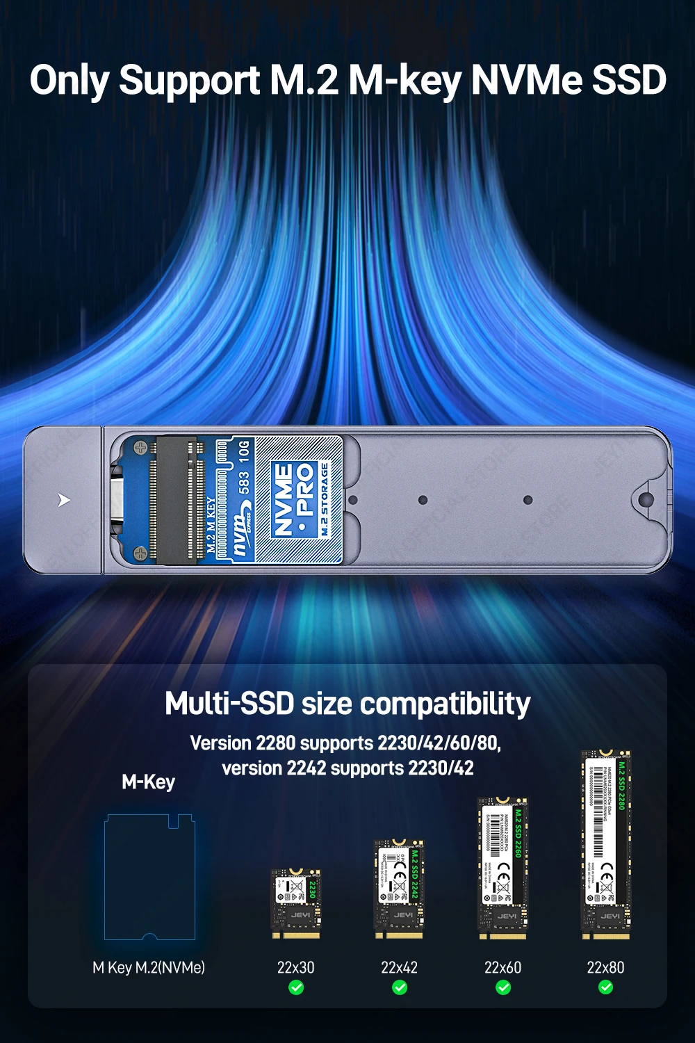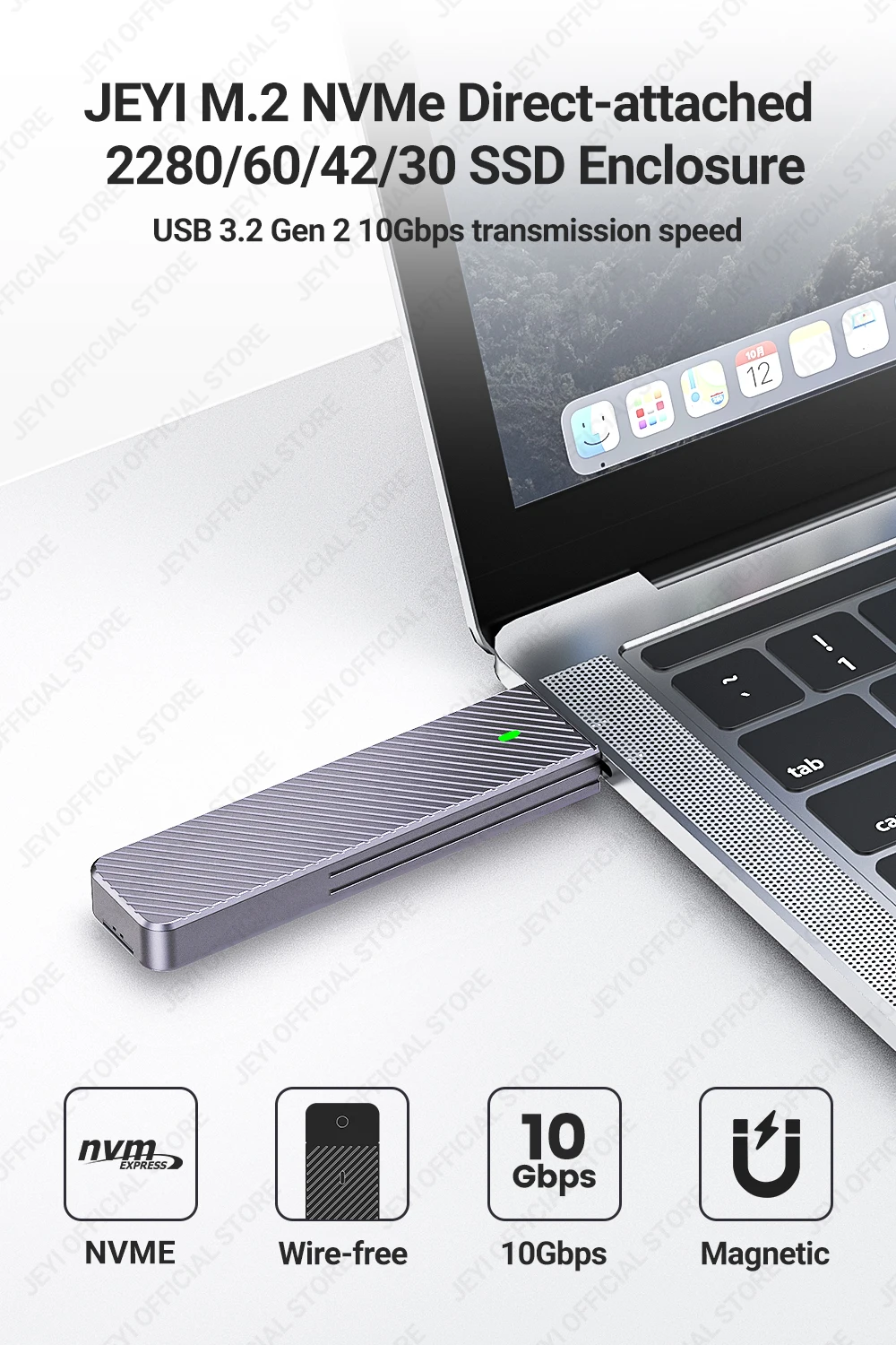 Maximice el potencial de su SSD NVMe con la carcasa JEYI M.2 SSD.Este estuche compacto y sin herramientas admite SSD M.2 NVMe M-Key (2230, 2242, 2260, 2280) y ofrece una transferencia de datos increíblemente rápida de 10 Gbps a través de la interfaz USB-C, sin necesidad de cables.