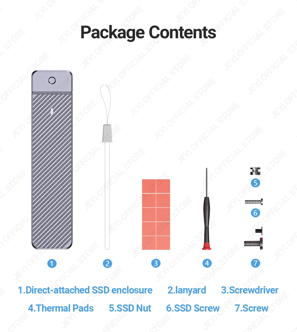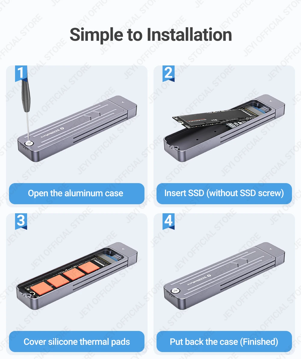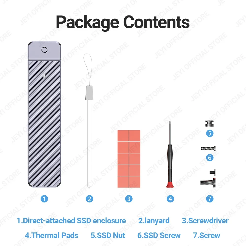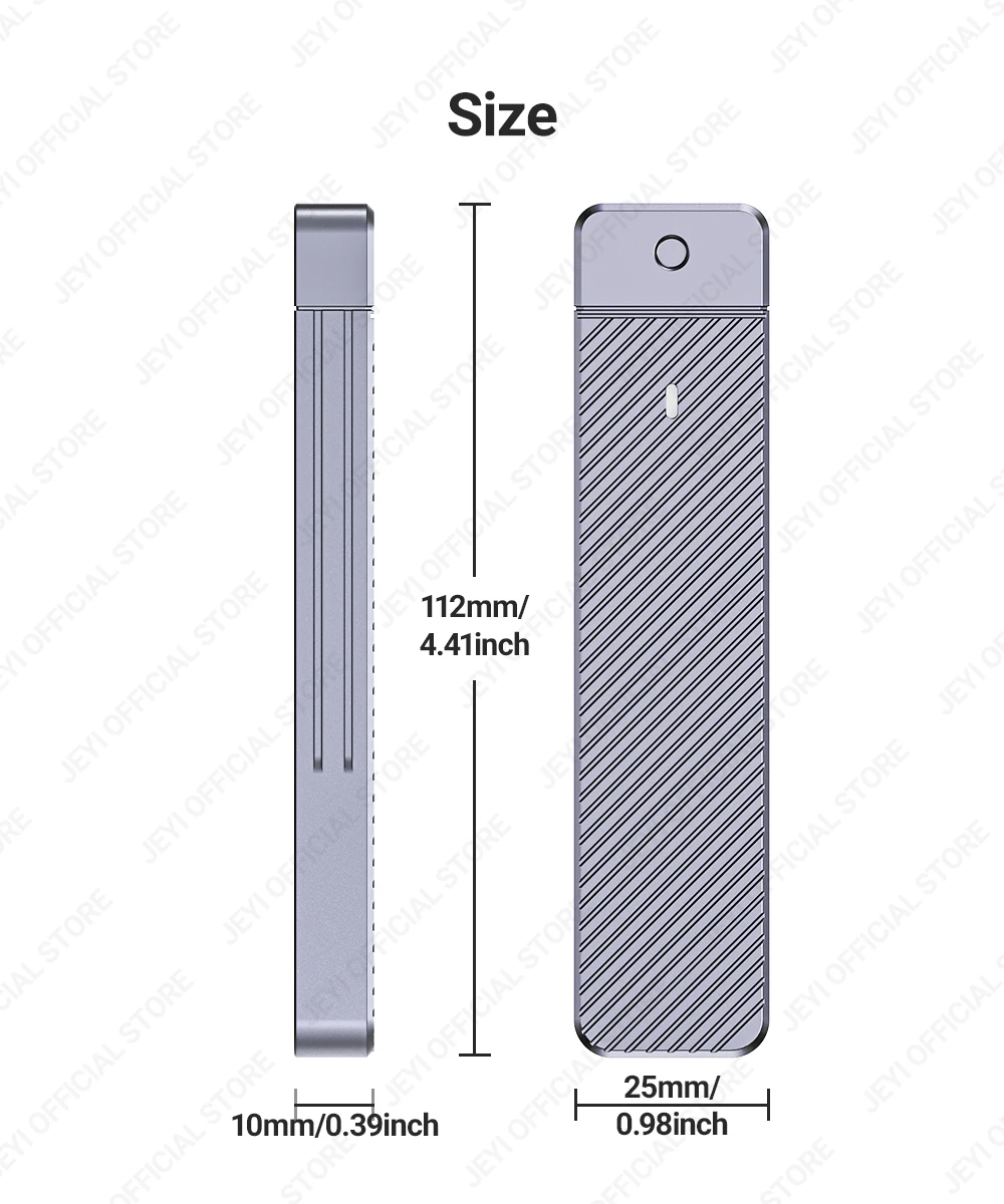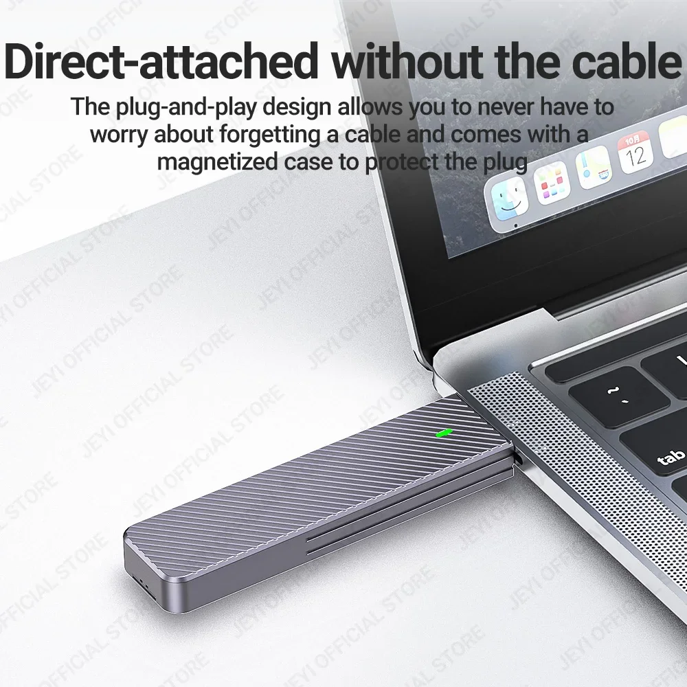 Maximice el potencial de su SSD NVMe con la carcasa JEYI M.2 SSD.Este estuche compacto y sin herramientas admite SSD M.2 NVMe M-Key (2230, 2242, 2260, 2280) y ofrece una transferencia de datos increíblemente rápida de 10 Gbps a través de la interfaz USB-C, sin necesidad de cables.