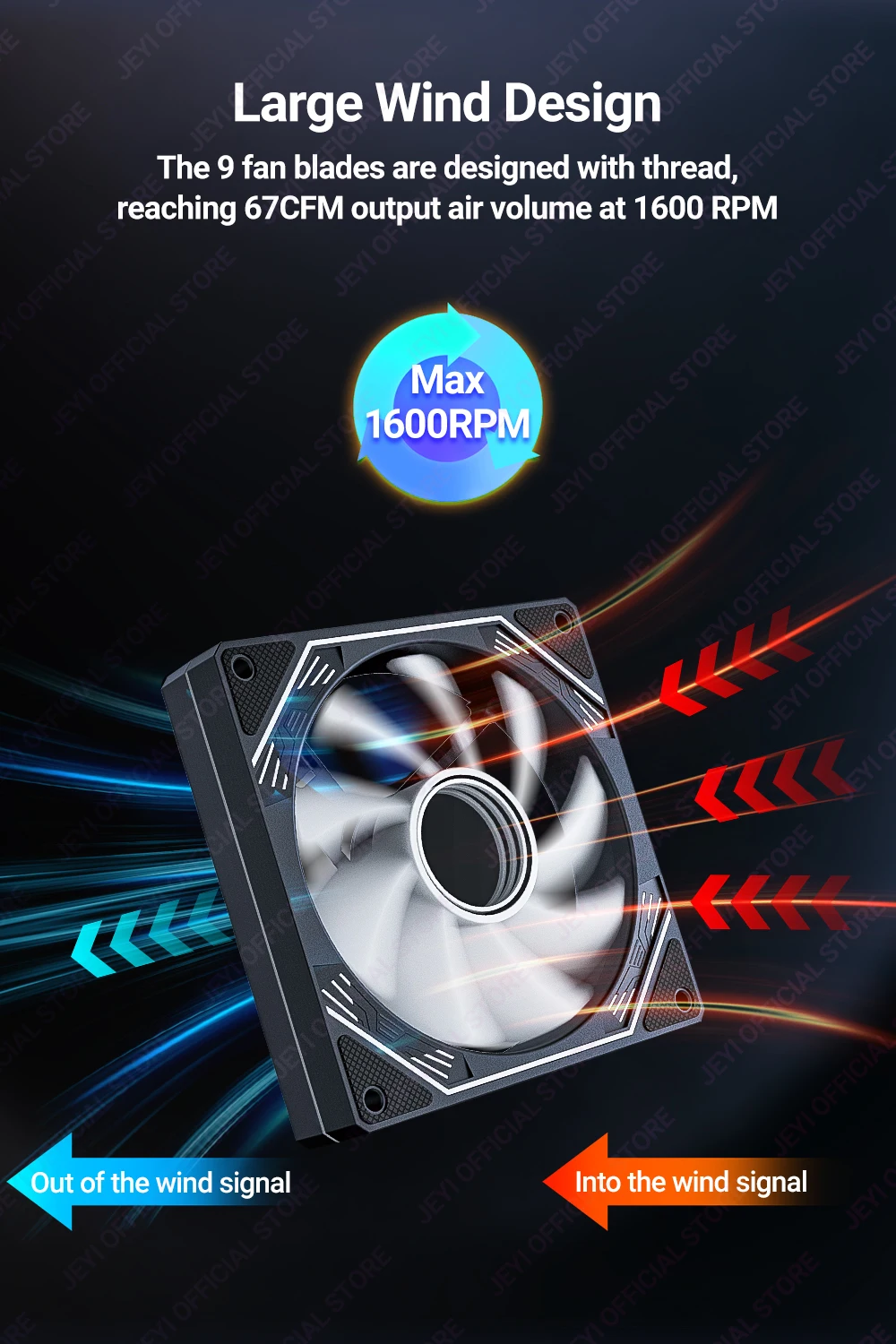 Las 9 aspas del ventilador están diseñadas con rosca, alcanzando un volumen de aire de salida de 67 CFM a 1600 RPM