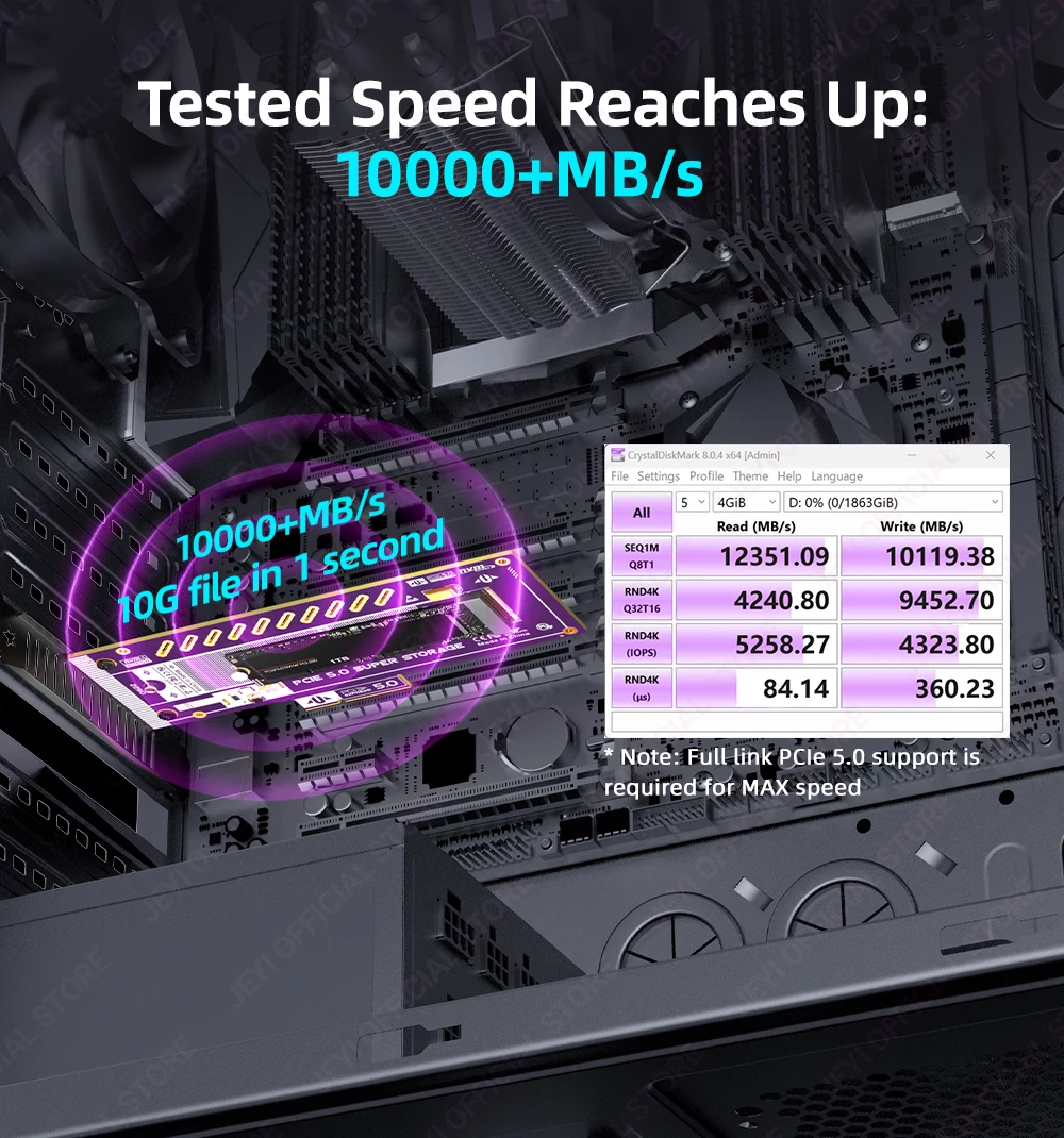 Admite ancho de banda de 128 Gbps, con velocidades de lectura medidas de hasta 12.351 MB/s y velocidades de escritura de hasta 10.119 MB/s (requiere un enlace PCIe 5.0 completo)