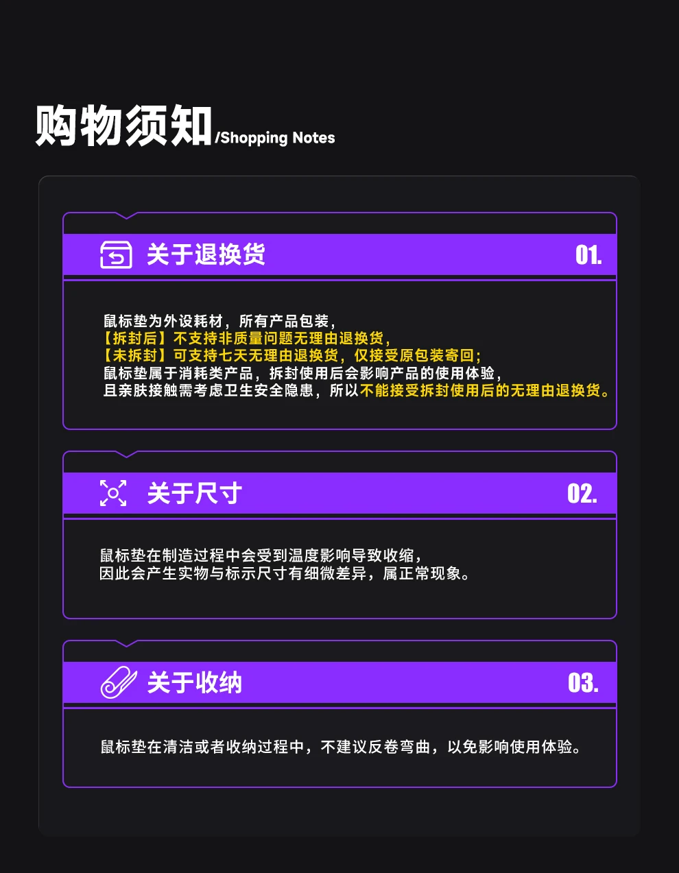 Las alfombrillas para mouse son consumibles periféricos y todo el embalaje del producto no admite devoluciones ni cambios incondicionales por problemas que no son de calidad después del desembalaje.Las alfombrillas de ratón sin abrir pueden admitir una devolución o cambio incondicional de siete días y solo aceptan devoluciones en su embalaje original; Las alfombrillas para ratón son productos consumibles y desembalarlas puede afectar la experiencia del usuario del producto.Además, el contacto respetuoso con la piel requiere en cuenta los riesgos de higiene y seguridad.Por lo tanto, no podemos aceptar devoluciones ni cambios incondicionales después del desembalaje y uso.