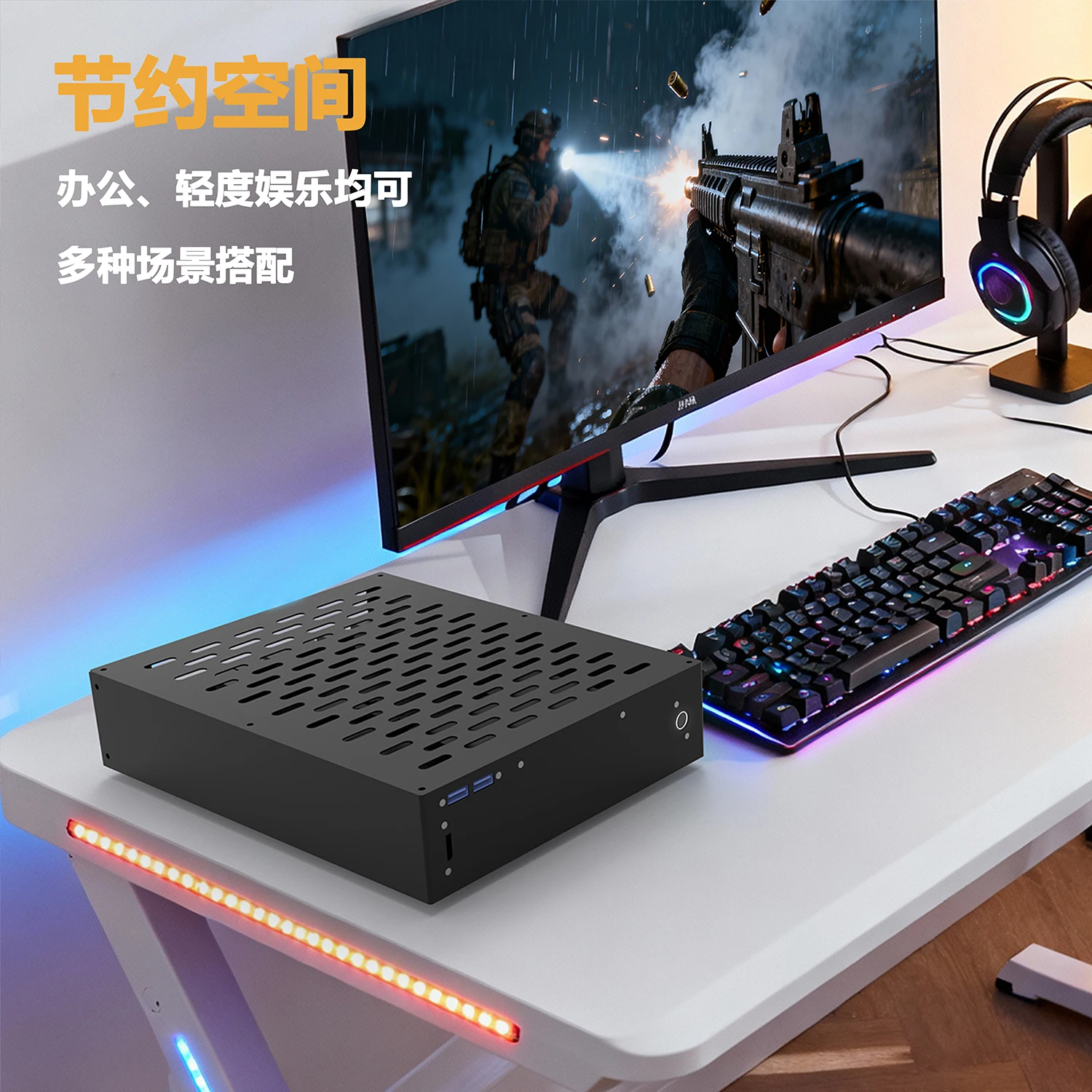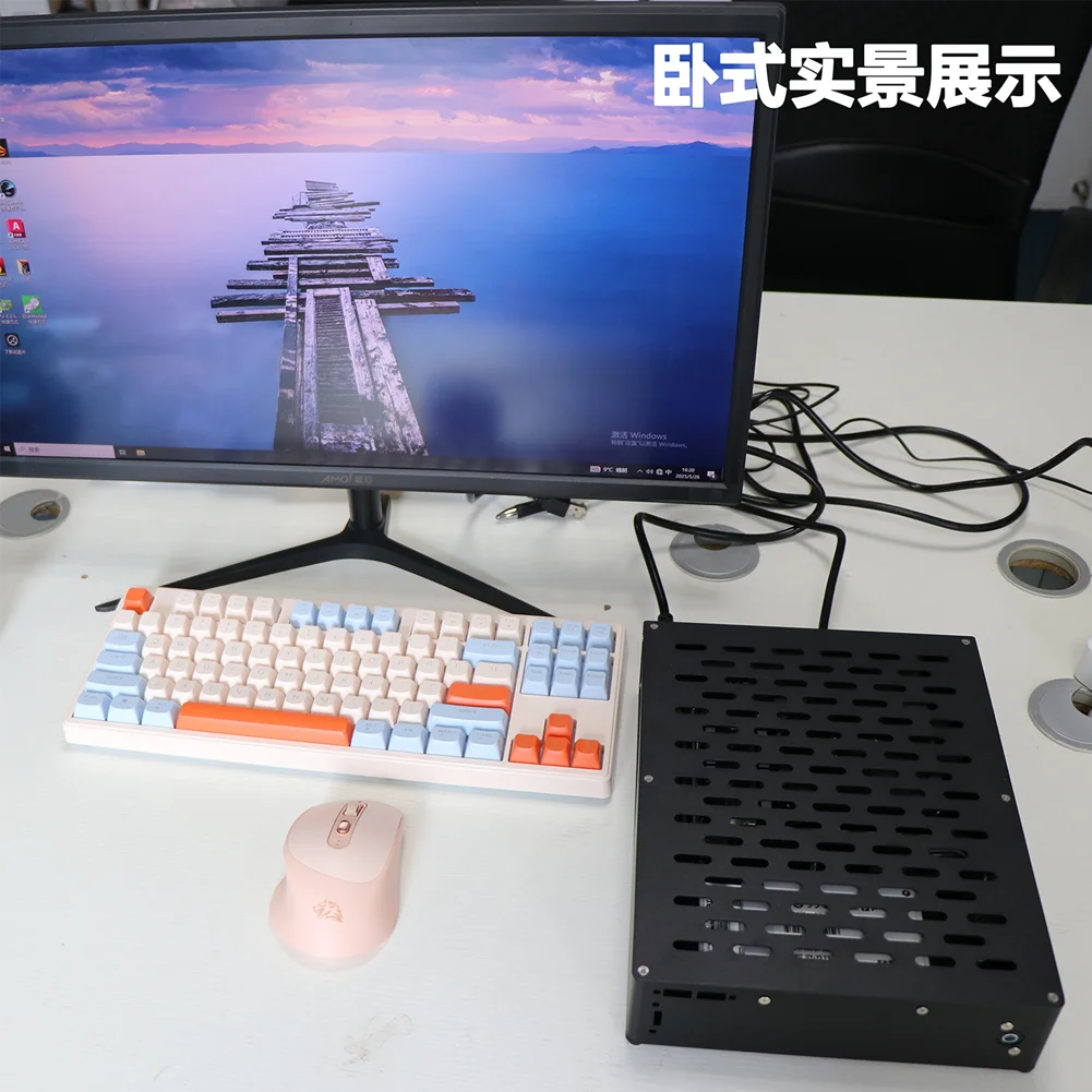 La carcasa pequeña para computadora gráfica integrada HTPC mini A2 ITX se puede utilizar como una pequeña consola de juegos de oficina en posición vertical y horizontal. Descripciones: Tipo de chasis:Chasis HTPC Mini Volumen del chasis:Longitud: 270 mm * Ancho: 58,5 mm * alto: 210 mm=3,3 L Dimensiones del embalaje:305*265*90mm Material:Hoja galvanizada de 1 mm de espesor, marco acrílico de 3 mm de espesor, columna de soporte de aleación de aluminio "Proceso":Doblado de chapa metálica, recubrimiento en polvo y barniz para hornear, proceso de doblado en caliente acrílico Especificaciones de la placa base:mini ITX 17CM * 17CM Especificación de la fuente de alimentación:Fuente de alimentación FLEX\小1U (500 W por encima), 150 mm * 81,5 mm * 40 mm Disco duro:Unidad de estado sólido de 2,5 pulgadas y 7 mm de espesor * 1 Ventilador:Ninguno Disipación de calor de la CPU:El límite de altura del enfriador de CPU es de 41 mm. Tarjeta gráfica:La tarjeta gráfica incorporada no es compatible.Puedes comprar elDOCK-OC5tarjeta gráfica externa en nuestra tienda Cable de alimentación:Cable adaptador de corriente Pin Zi adjunto. La línea de alimentación no está incluida.