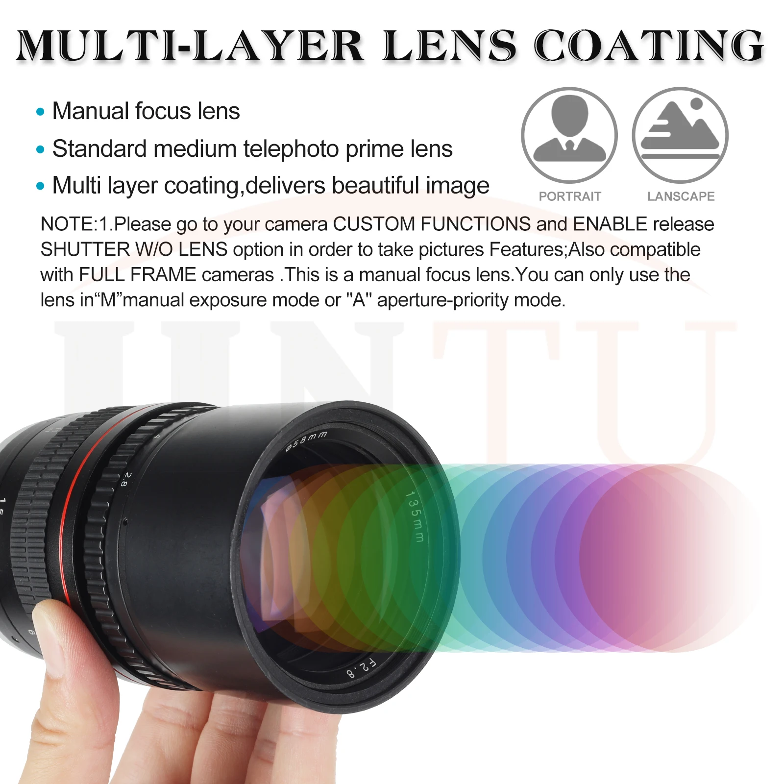 Este 135 mm f/2,8 de jintu está diseñado para cámaras DSLR Canon con montura EF.Su corta distancia focal de teleobjetivo lo hace ideal para aplicaciones de retratos, y la rápida apertura máxima de f/2.8 ofrece un amplio control sobre la profundidad de campo y también permite trabajar en condiciones de iluminación difíciles.Un Super Multi-Coating HD también se ha aplicado a elementos individuales para minimizar los destellos y las imágenes fantasma para mejorar el contraste y la neutralidad del color al disparar en situaciones brillantes o retroiluminadas.Además, el diseño de enfoque manual ofrece un control preciso sobre la posición de enfoque y un diafragma de seis hojas contribuye a una calidad bokeh agradable para mejorar aún más la profundidad superficial de las imágenes de campo.