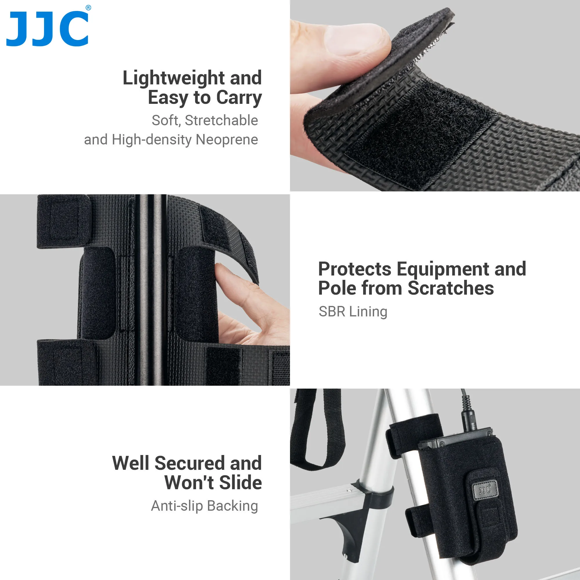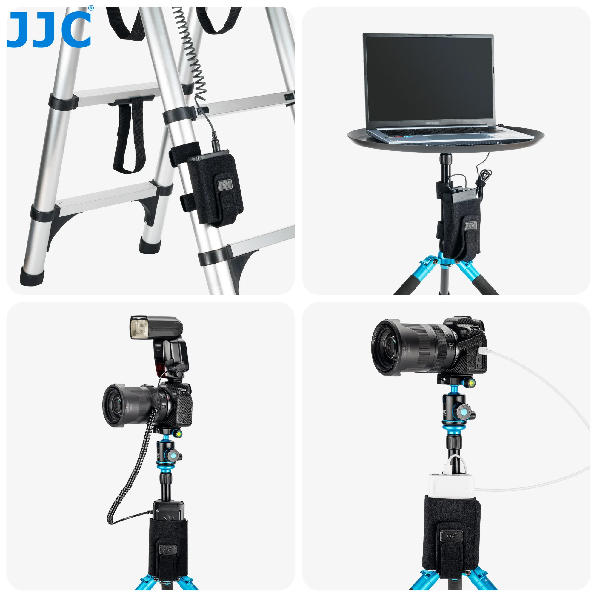 La correa de montaje del equipo JJC EMS-L está especialmente diseñada para sostener un banco de energía, una batería externa flash, un control remoto, un teléfono inteligente, un flash fuera de la cámara, un disco duro externo u otros engranajes dentro de su soporte triple ajustable.Se puede fijar a la pata de un trípode, un soporte de luz, una escalera de fotografía, un poste, una viga u otros objetos para acceder rápida y fácilmente a los artículos que necesitará durante las sesiones de fotos.