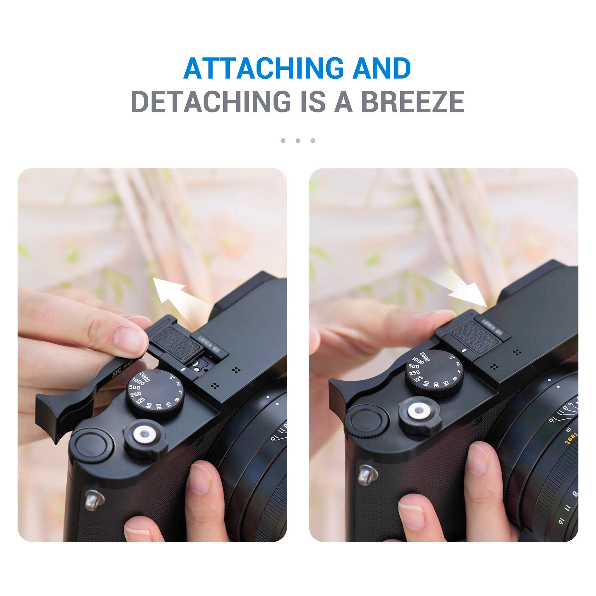 4. Fácil fijación y desmontaje: ¡No hay necesidad de instalaciones complicadas!Nuestro Thumbs Up Grip se conecta fácilmente a la zapata de su cámara deslizándola hacia adentro y se puede quitar sin esfuerzo cuando no sea necesario.