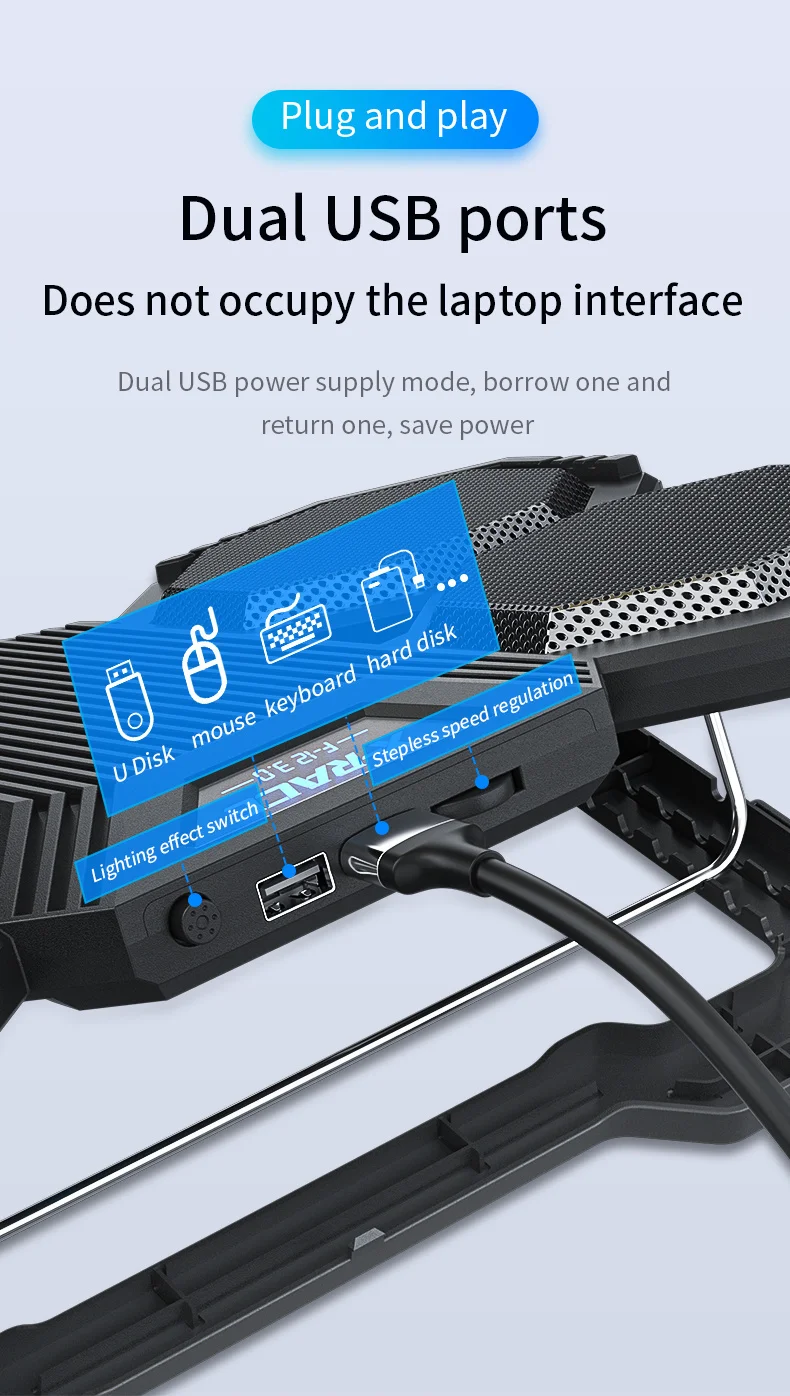 5. Una almohadilla de enfriamiento para computadora portátil con una interfaz de alimentación compuesta USB, una interfaz USB del radiador se usa para alimentar la computadora portátil, la otra interfaz USB se usa para otros dispositivos, Y hay un diseño de almacenamiento oculto en la parte posterior para el cable USB;