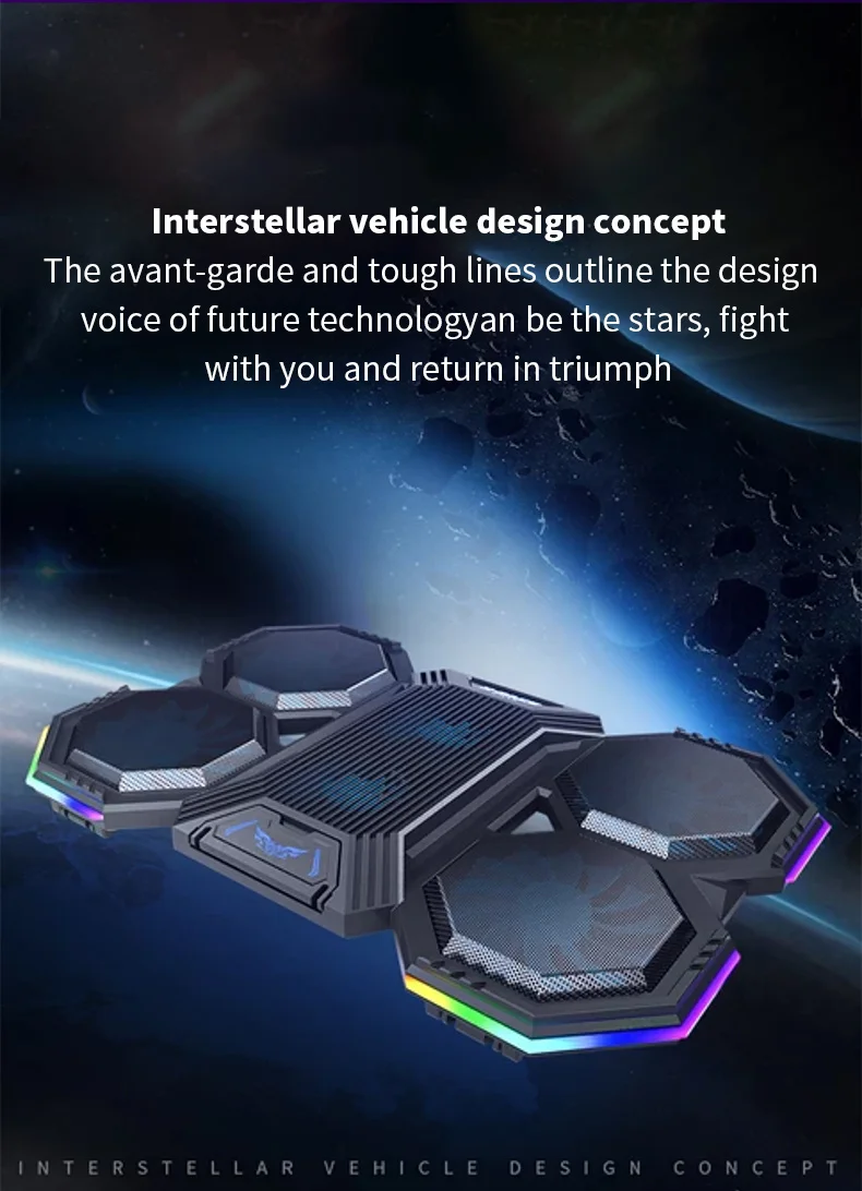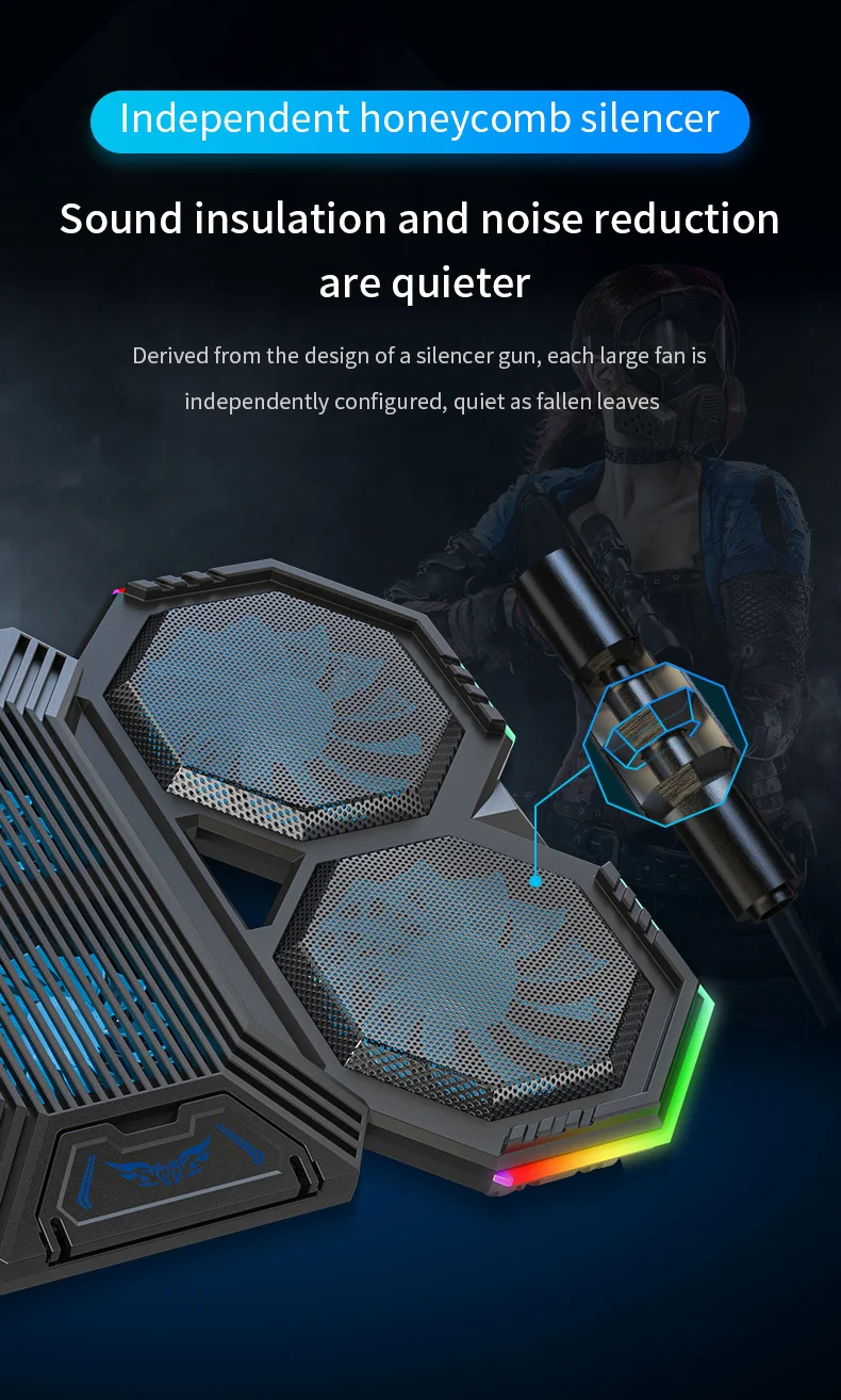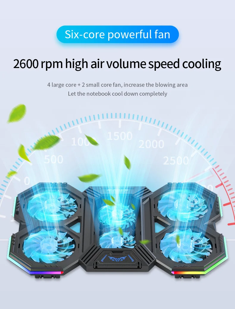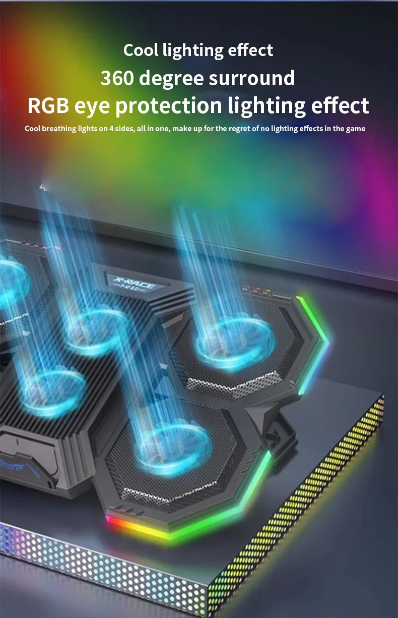 1,6 ventiladores grandes proporcionan una súper disipación de calor para la computadora portátil, ajusta libremente la velocidad del viento por la perilla, iluminación envolvente RGB de 360 °;