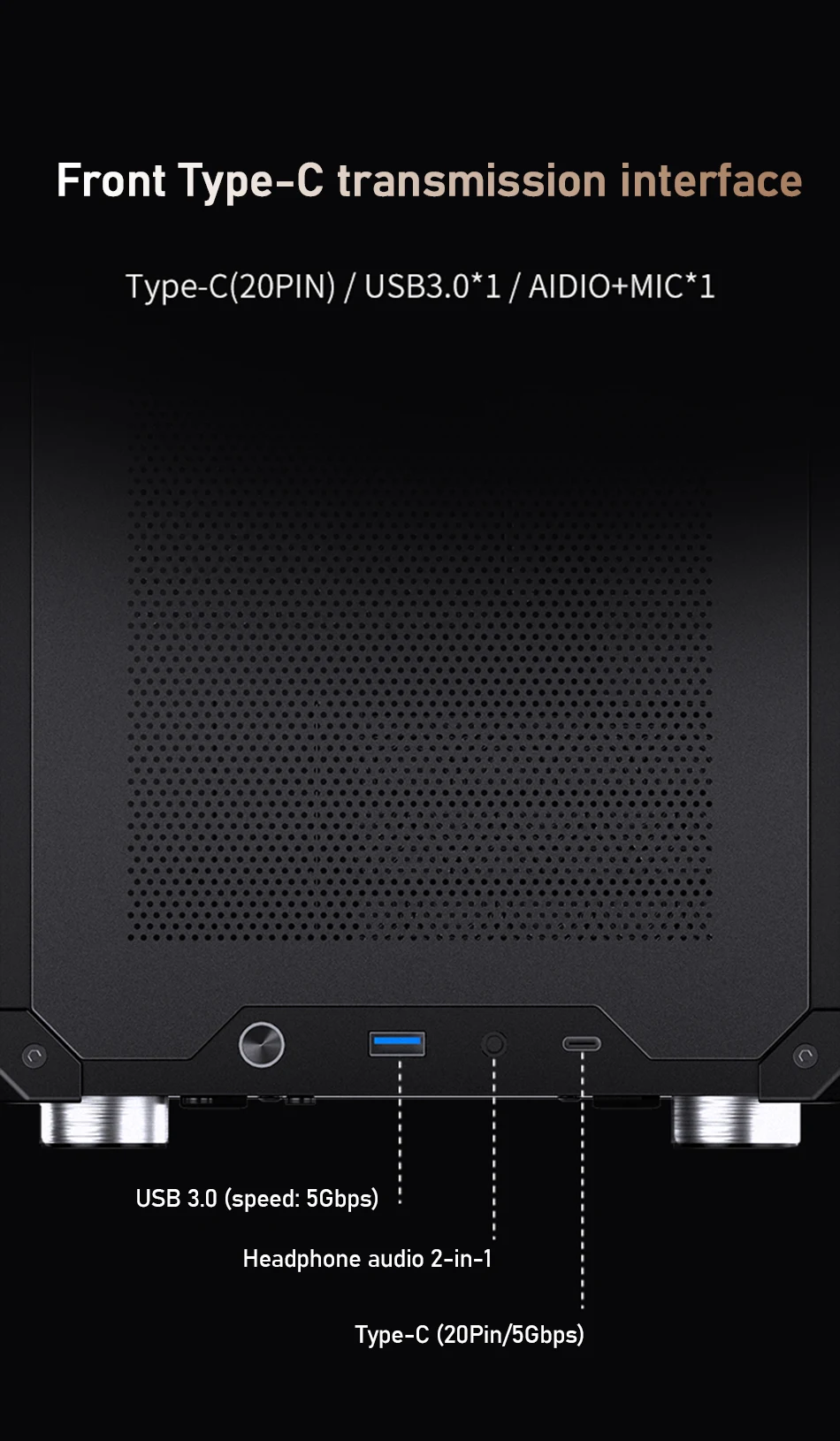 Front I/O ports: Type-C (20PIN)/USB3.0 * 1/AUDIO * 1+MIC * 1 (2-in-1)