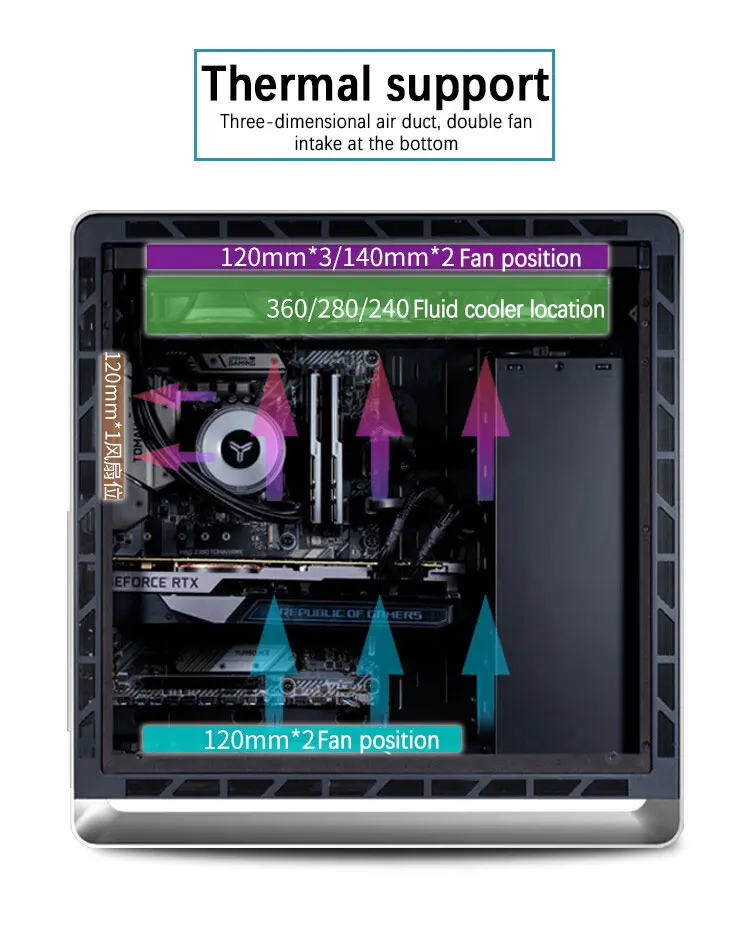 Sistema de refrigeración por agua: parte superior: 240mm * 1 o 280mm * 1 o 360mm * 1 (opcional);