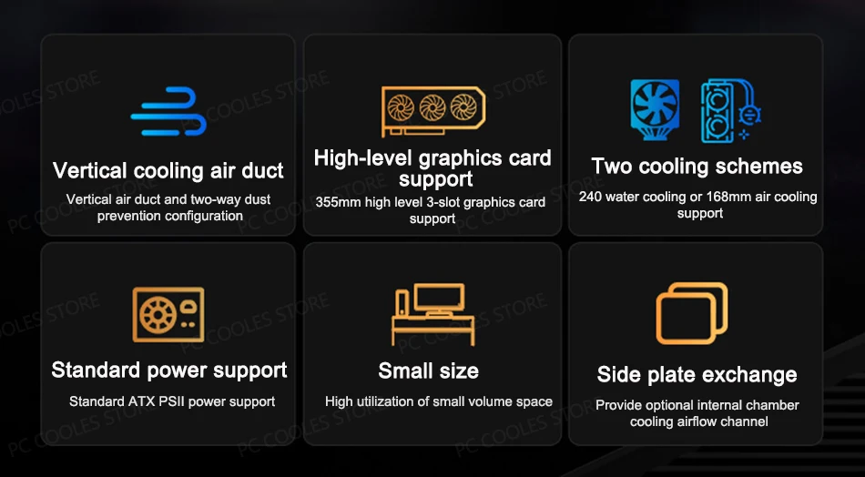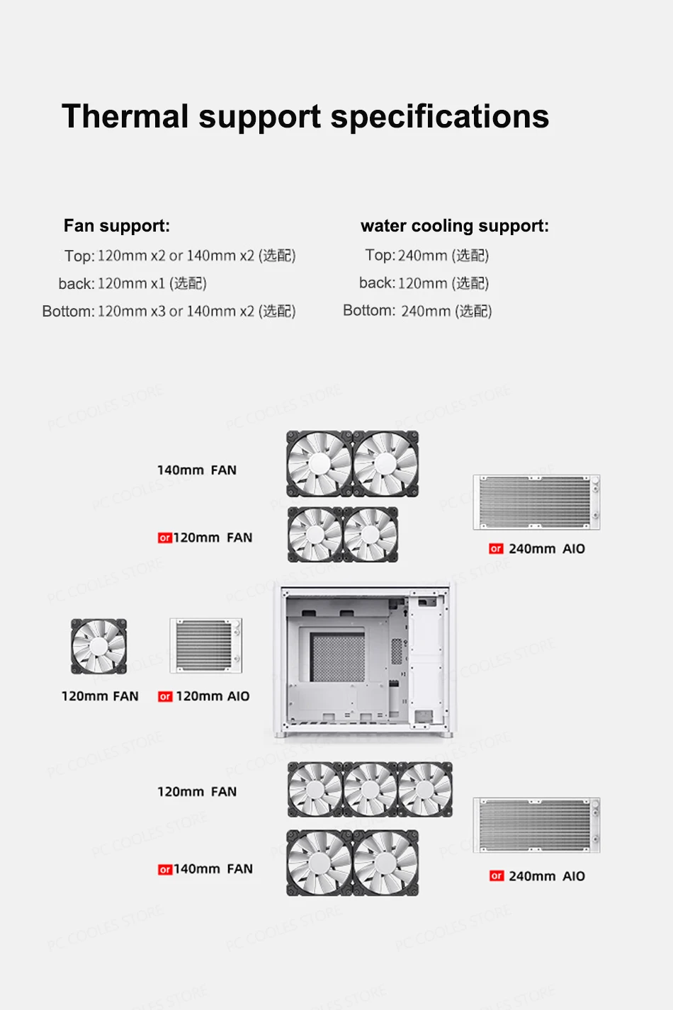 Refrigeración por agua: parte superior: 120mm * 2 o 140mm * 2 (opción) Parte posterior: 120*1mm (opción) Parte inferior: 120mm * 3 o 140mm * 2 (opción)