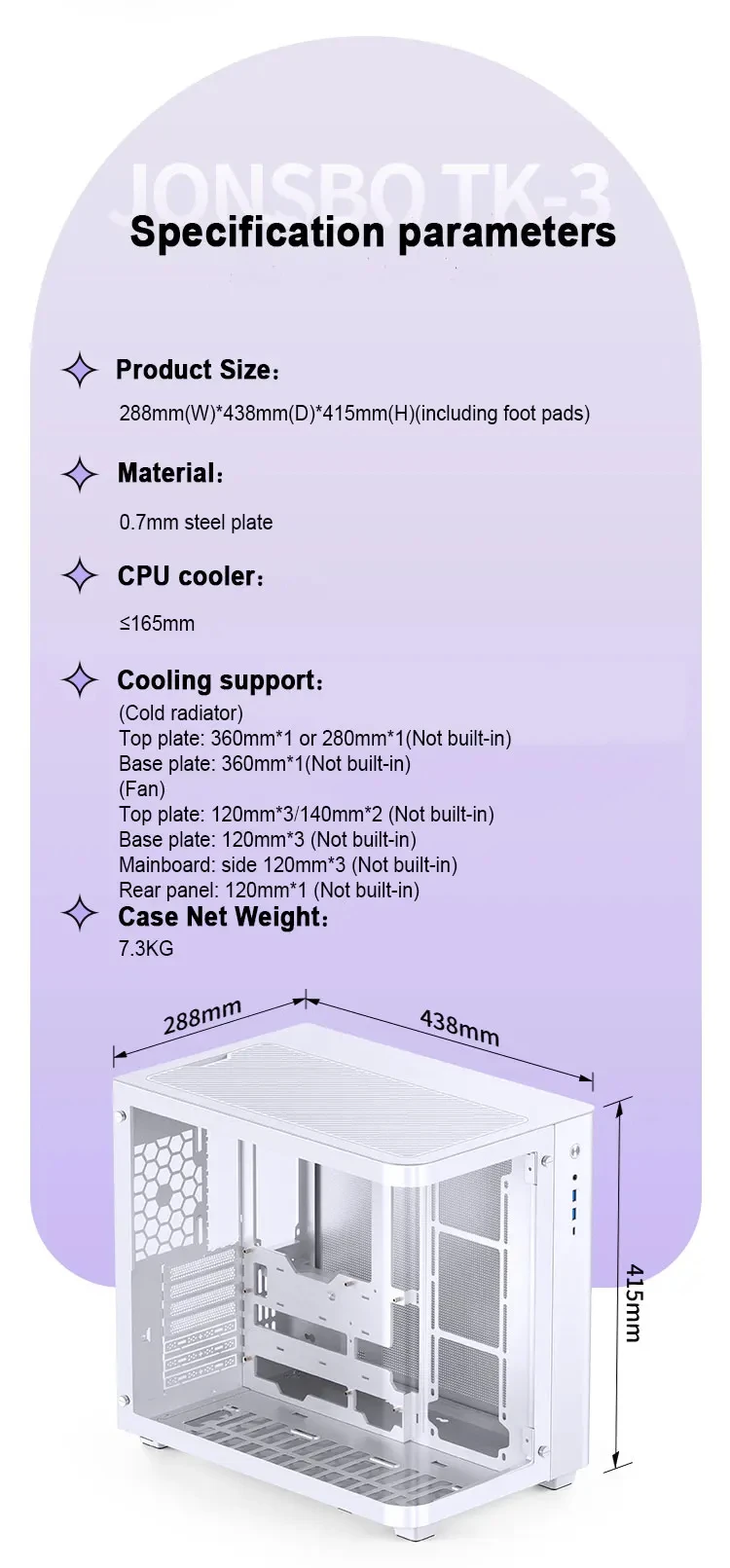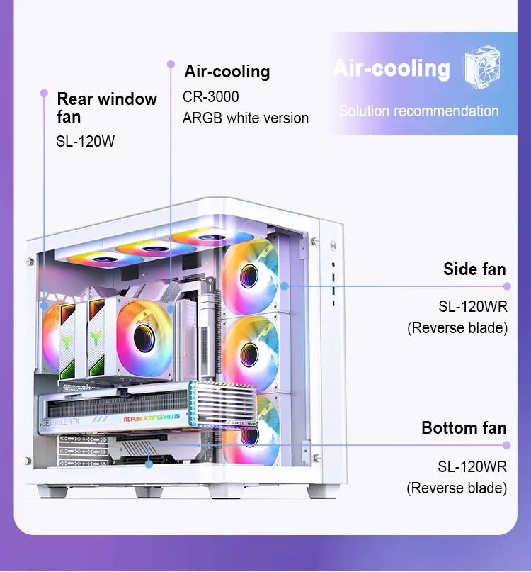 Sistema de refrigeración: Superior: 120mm * 3/140mm * 2 (opcional); inferior: 120mm * 3 (opcional) lateral de la placa base: 120mm * 3 (opcional); panel trasero: 120mm * 1 (opcional)