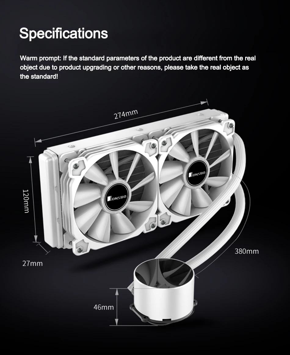 Tamaño: bomba: 80,3mm * 67mm * 46mm; radiador: 274mm * 120mm * 27mm; ventilador: 120mm * 120mm * 25mm