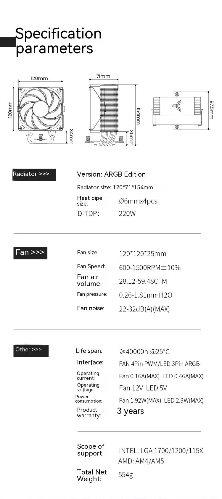 Tamaño del radiador: 120mm(L)* 71mm(W)* 154mm(H)