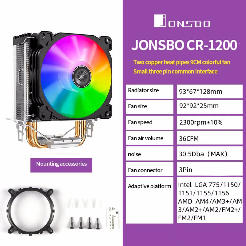 Comprar Jonsbo-enfriador de Cpu CR1200, 2 tubos de calor, procesador de torre, 3 pines, para Intel 1151, AMD, AM4, RGB