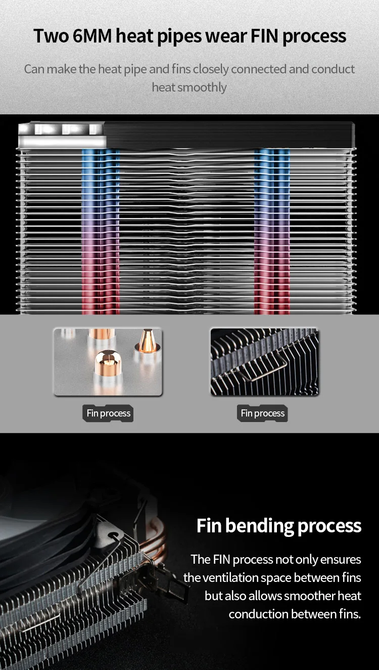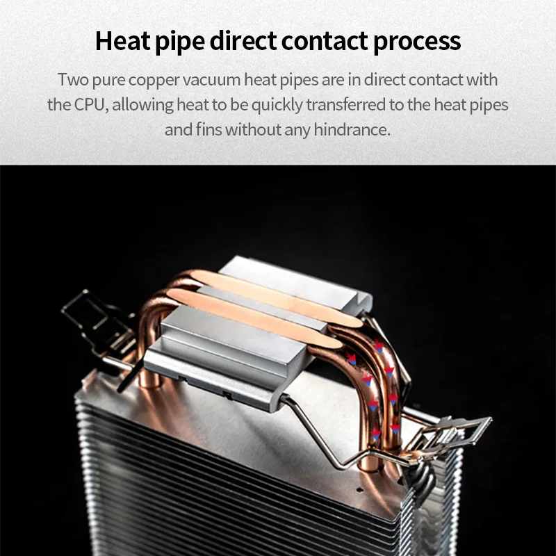 Dos tubos de calor al vacío de cobre puro están en contacto directo con la CPU, lo que permite que el calor se transfiere rápidamente a los tubos de calor y aletas sin ningún obstáculo.