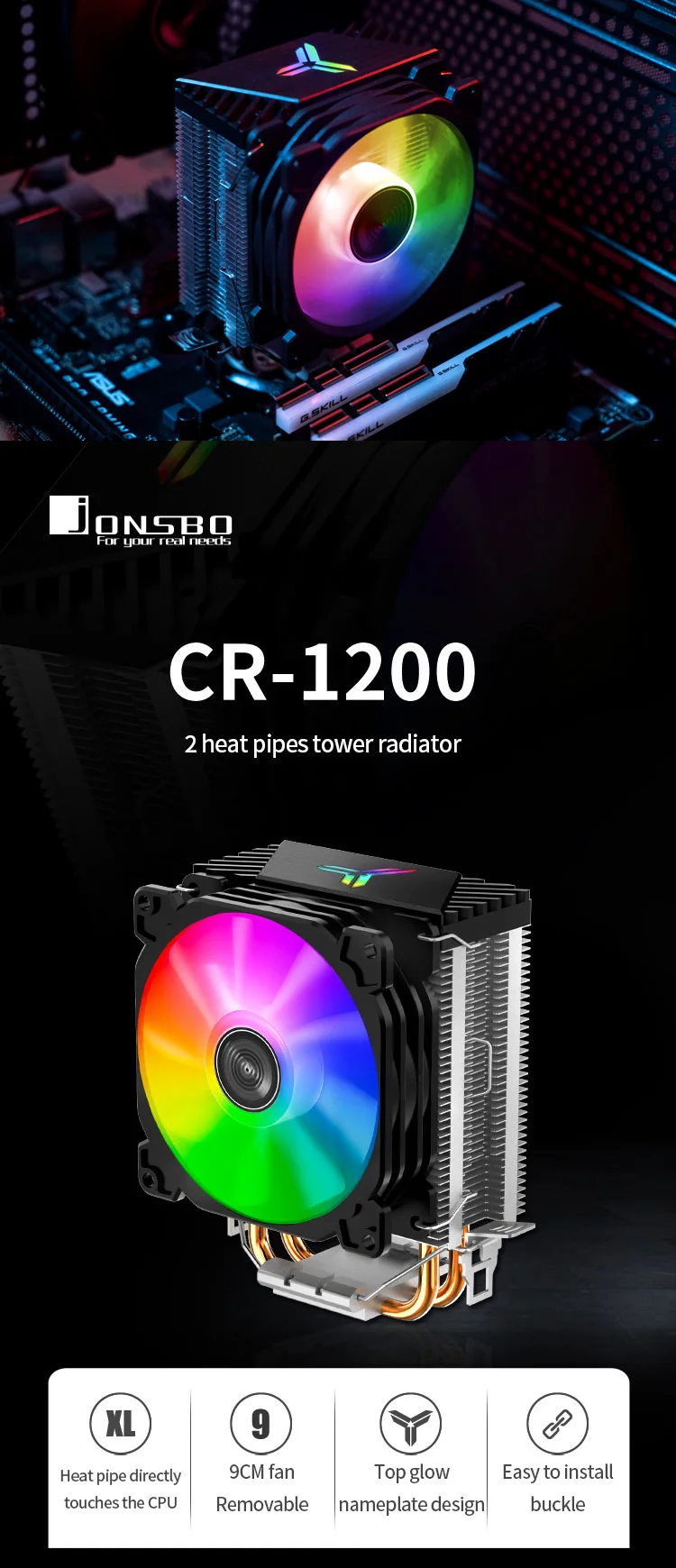 Comprar Jonsbo-enfriador de CPU CR1200, torre de 2 tubos de calor, efecto de luz colorido RGB, ventilador de 9cm para Intel 1151 1700 AMD AM4, hebilla LGA2011 opcional