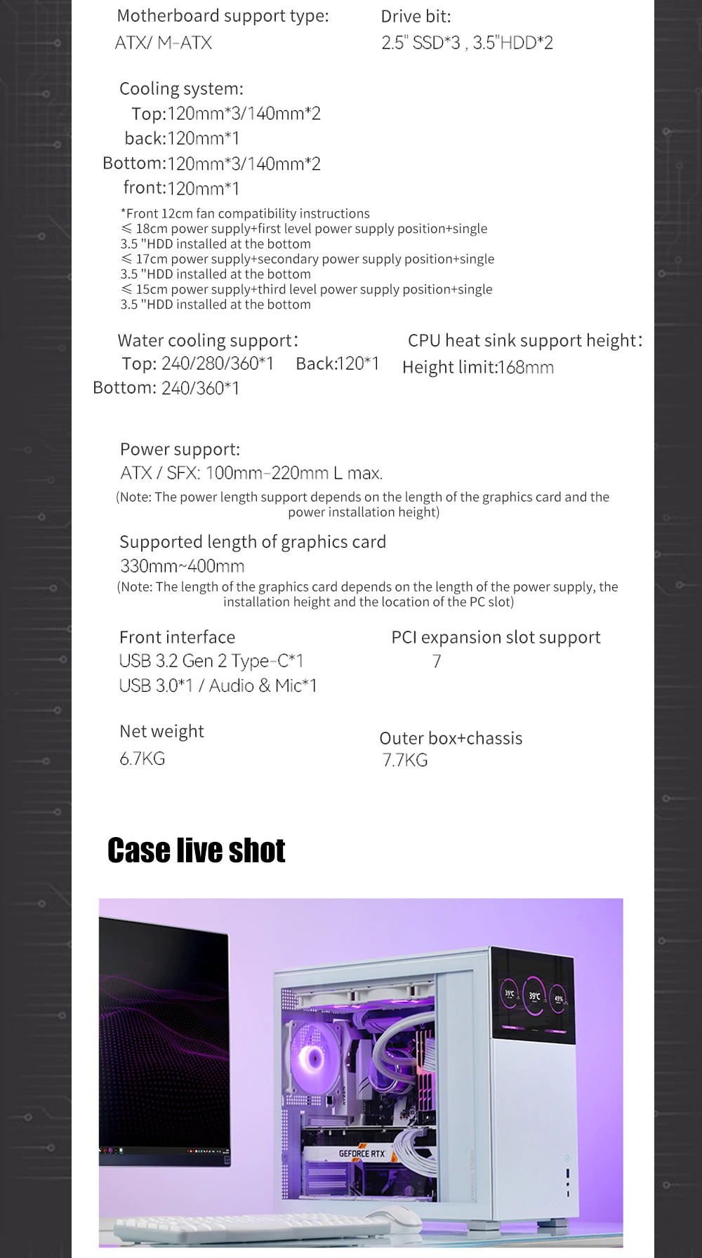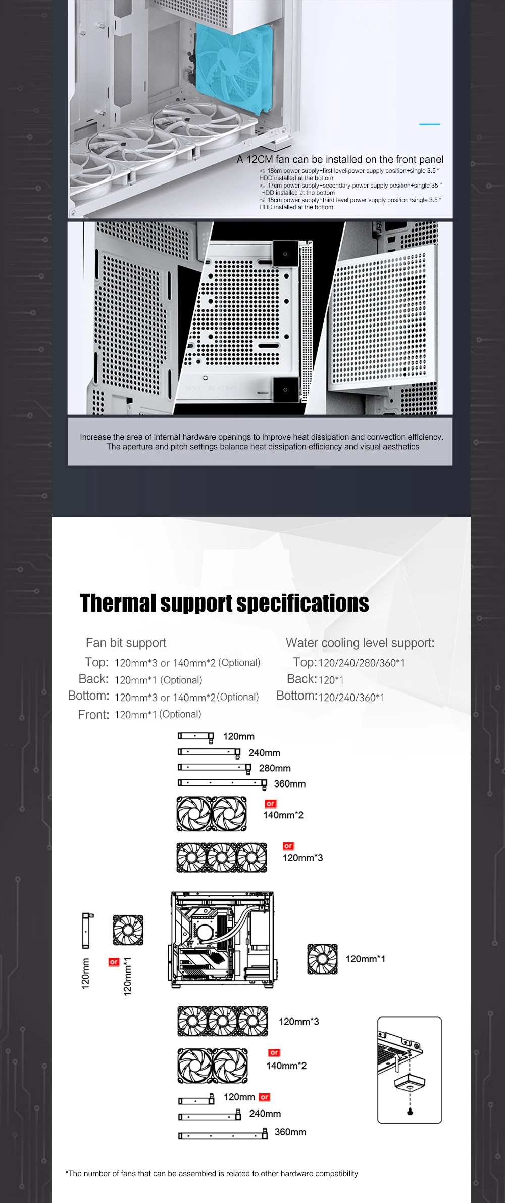 Posición de montaje del ventilador: Superior 120mm * 3 o 140mm * 2 trasero 120*1mm inferior 120mm * 3 o 140mm * 2 frontal 120mm * 1