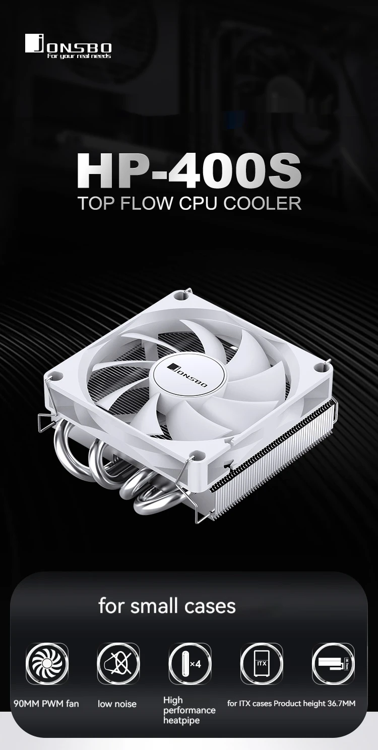 Jonsbo HP-400S Enfriador de CPU de flujo superior Perfil bajo 4 tubos de calor Refrigeración por aire PWM Ventilador controlado por temperatura Enfriador de aire de 9CM para estuche ITX